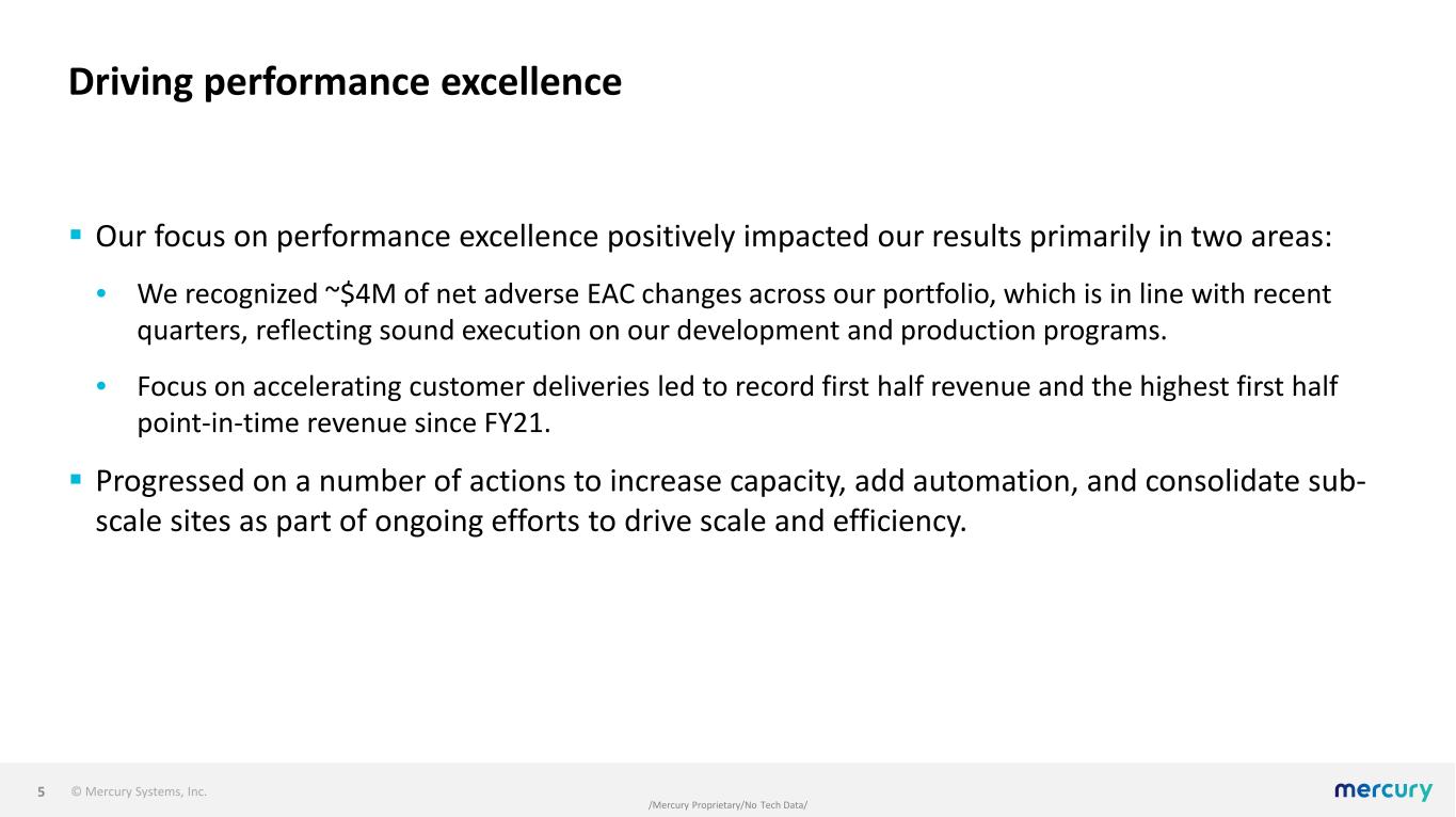 © Mercury Systems, Inc. /Mercury Proprietary/No Tech Data/ Business and results  Results support our expectation to deliver robust organic growth, expanding margins, and positive free cash flow.  Quarterly bookings of $288M and a 1.23 book-to-bill resulting in record backlog approaching $1.5B.  Q2 revenue of $233M, with record first half revenue up 7.1% year-over-year.  Q2 adjusted EBITDA of $30M and adjusted EBITDA margin of 12.9% (up 36.3% and 300 basis points respectively, year-over-year).  Free cash flow of $46M, well ahead of our expectations. Ended Q2 with $335M of cash on hand.  Solid execution across our broad portfolio of production and development programs.  Streamlined operating structure enabling increased positive operating leverage.  Continued progress on free cash flow drivers with net working capital down $61M year-over-year. 4