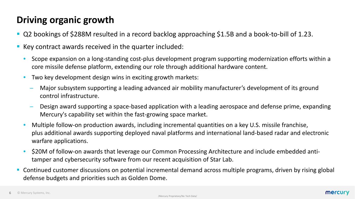 © Mercury Systems, Inc. /Mercury Proprietary/No Tech Data/ Driving performance excellence  Our focus on performance excellence positively impacted our results primarily in two areas: • We recognized ~$4M of net adverse EAC changes across our portfolio, which is in line with recent quarters, reflecting sound execution on our development and production programs. • Focus on accelerating customer deliveries led to record first half revenue and the highest first half point-in-time revenue since FY21.  Progressed on a number of actions to increase capacity, add automation, and consolidate sub- scale sites as part of ongoing efforts to drive scale and efficiency. 5