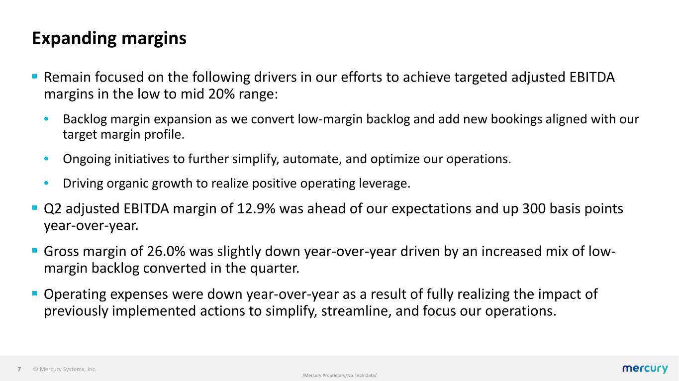 © Mercury Systems, Inc. /Mercury Proprietary/No Tech Data/ Driving organic growth  Q2 bookings of $288M resulted in a record backlog approaching $1.5B and a book-to-bill of 1.23.  Key contract awards received in the quarter included: • Scope expansion on a long-standing cost-plus development program supporting modernization efforts within a core missile defense platform, extending our role through additional hardware content. • Two key development design wins in exciting growth markets: ̶ Major subsystem supporting a leading advanced air mobility manufacturer’s development of its ground control infrastructure. ̶ Design award supporting a space-based application with a leading aerospace and defense prime, expanding Mercury's capability set within the fast-growing space market. • Multiple follow-on production awards, including incremental quantities on a key U.S. missile franchise, plus additional awards supporting deployed naval platforms and international land-based radar and electronic warfare applications. • $20M of follow-on awards that leverage our Common Processing Architecture and include embedded anti- tamper and cybersecurity software from our recent acquisition of Star Lab.  Continued customer discussions on potential incremental demand across multiple programs, driven by rising global defense budgets and priorities such as Golden Dome. 6