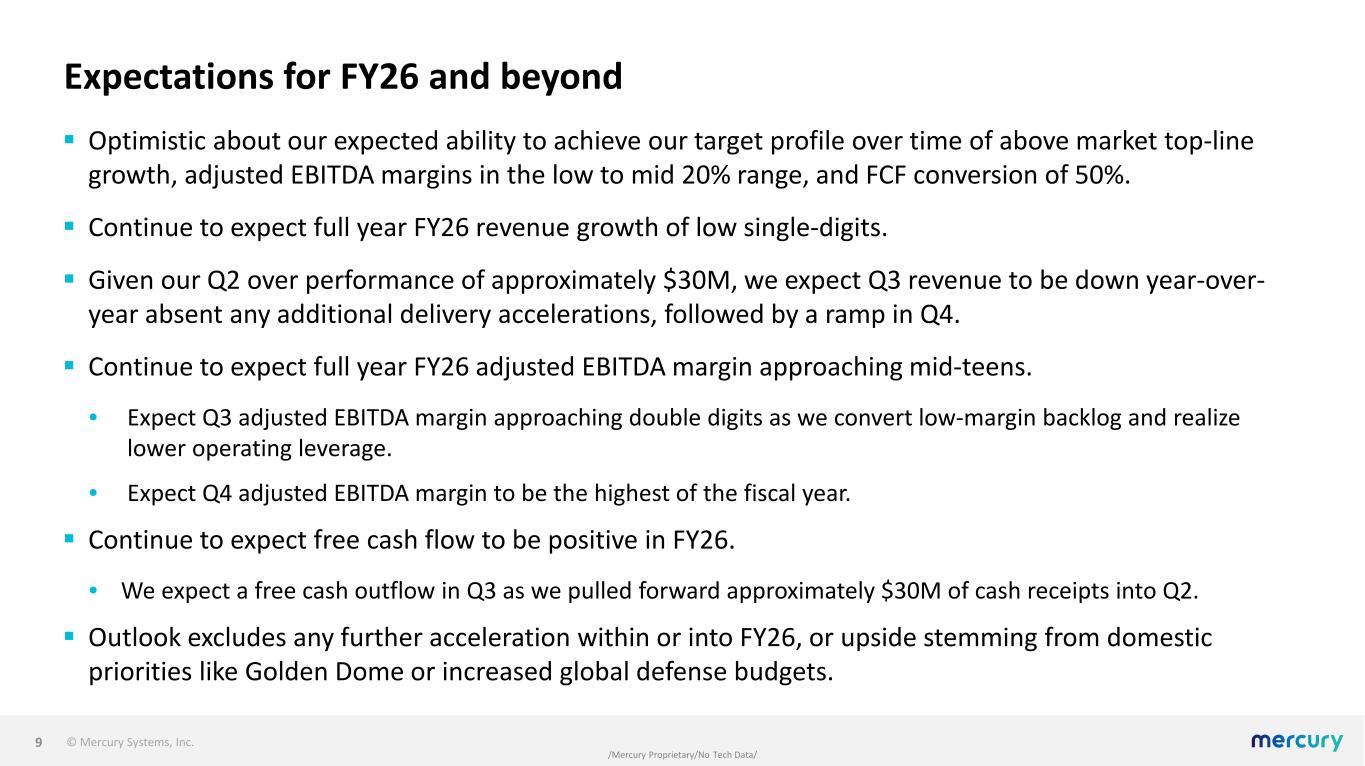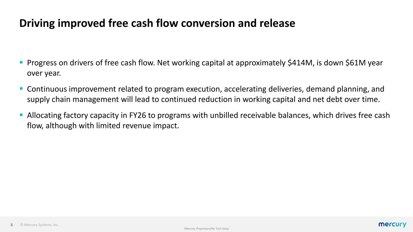© Mercury Systems, Inc. /Mercury Proprietary/No Tech Data/ Driving improved free cash flow conversion and release  Progress on drivers of free cash flow. Net working capital at approximately $414M, is down $61M year over year.  Continuous improvement related to program execution, accelerating deliveries, demand planning, and supply chain management will lead to continued reduction in working capital and net debt over time.  Allocating factory capacity in FY26 to programs with unbilled receivable balances, which drives free cash flow, although with limited revenue impact. 8