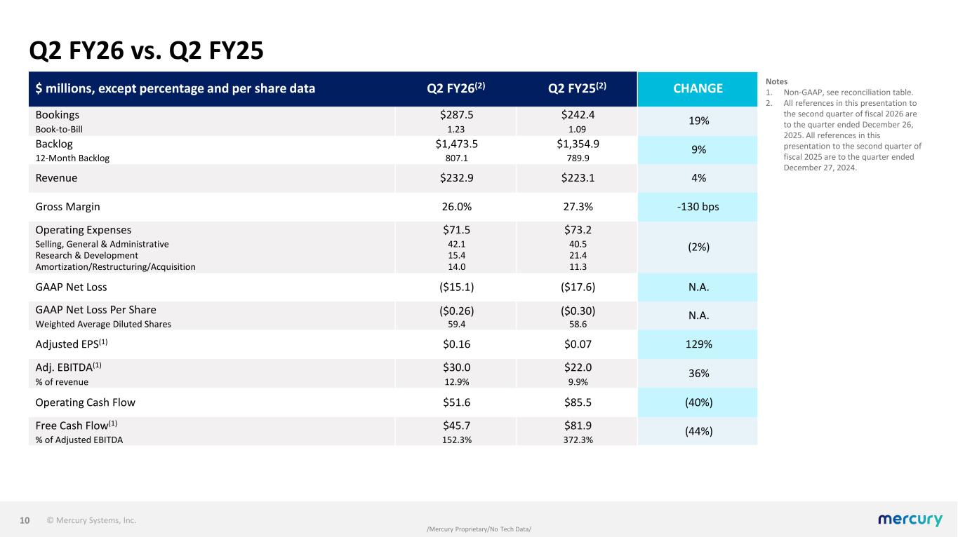 © Mercury Systems, Inc. /Mercury Proprietary/No Tech Data/ Expectations for FY26 and beyond  Optimistic about our expected ability to achieve our target profile over time of above market top-line growth, adjusted EBITDA margins in the low to mid 20% range, and FCF conversion of 50%.  Continue to expect full year FY26 revenue growth of low single-digits.  Given our Q2 over performance of approximately $30M, we expect Q3 revenue to be down year-over- year absent any additional delivery accelerations, followed by a ramp in Q4.  Continue to expect full year FY26 adjusted EBITDA margin approaching mid-teens. • Expect Q3 adjusted EBITDA margin approaching double digits as we convert low-margin backlog and realize lower operating leverage. • Expect Q4 adjusted EBITDA margin to be the highest of the fiscal year.  Continue to expect free cash flow to be positive in FY26. • We expect a free cash outflow in Q3 as we pulled forward approximately $30M of cash receipts into Q2.  Outlook excludes any further acceleration within or into FY26, or upside stemming from domestic priorities like Golden Dome or increased global defense budgets. 9