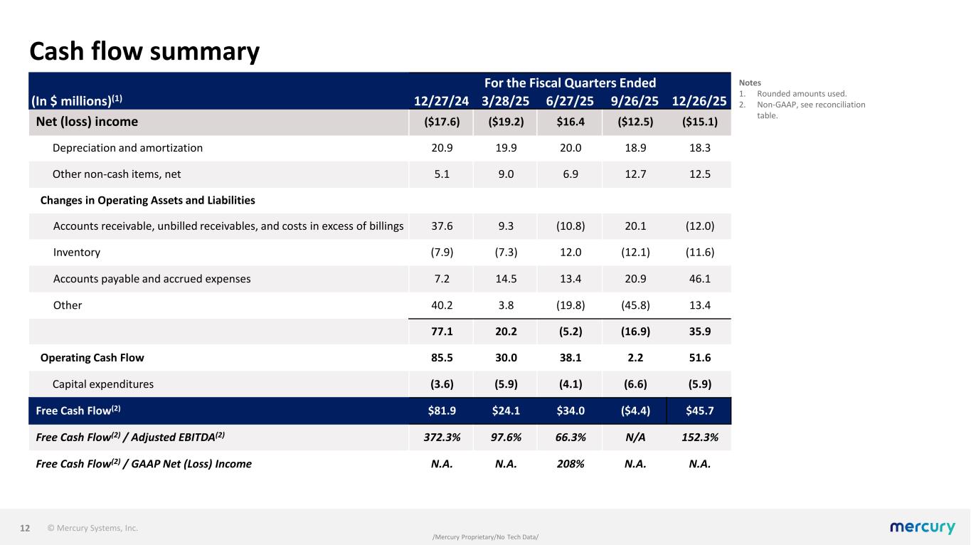 © Mercury Systems, Inc. /Mercury Proprietary/No Tech Data/ Balance sheet 11 Notes 1. Rounded amounts used. As of (In $ millions)(1) 12/27/24 3/28/25 6/27/25 9/26/25 12/26/25 ASSETS Cash & cash equivalents $242.6 $269.8 $309.1 $304.7 $335.0 Accounts receivable and unbilled receivables, net 383.1 374.7 388.1 367.5 379.8 Inventory, net 344.4 352.7 332.9 340.2 349.6 PP&E, net 111.5 107.5 101.4 102.6 102.0 Goodwill and intangibles, net 1,164.2 1,154.1 1,148.7 1,138.5 1,131.3 Other 155.7 155.6 154.6 204.1 204.4 TOTAL ASSETS $2,401.5 $2,414.4 $2,434.8 $2,457.6 $2,502.1 LIABILITIES AND S/E AP and accrued expenses $137.3 $154.1 $173.6 $196.7 $246.1 Deferred revenues and customer advances 136.0 142.5 126.8 125.5 136.9 Other liabilities 76.4 75.2 69.4 68.9 67.6 Debt 591.5 591.5 591.5 591.5 591.5 Total liabilities 941.2 963.3 961.3 982.6 1,042.1 Stockholders' equity 1,460.3 1,451.1 1,473.5 1,475.0 1,460.0 TOTAL LIABILITIES AND S/E $2,401.5 $2,414.4 $2,434.8 $2,457.6 $2,502.1