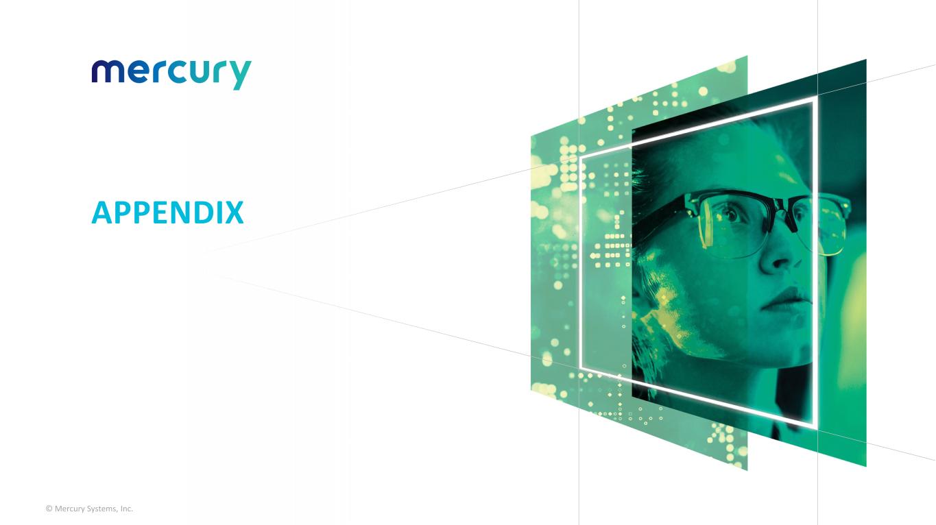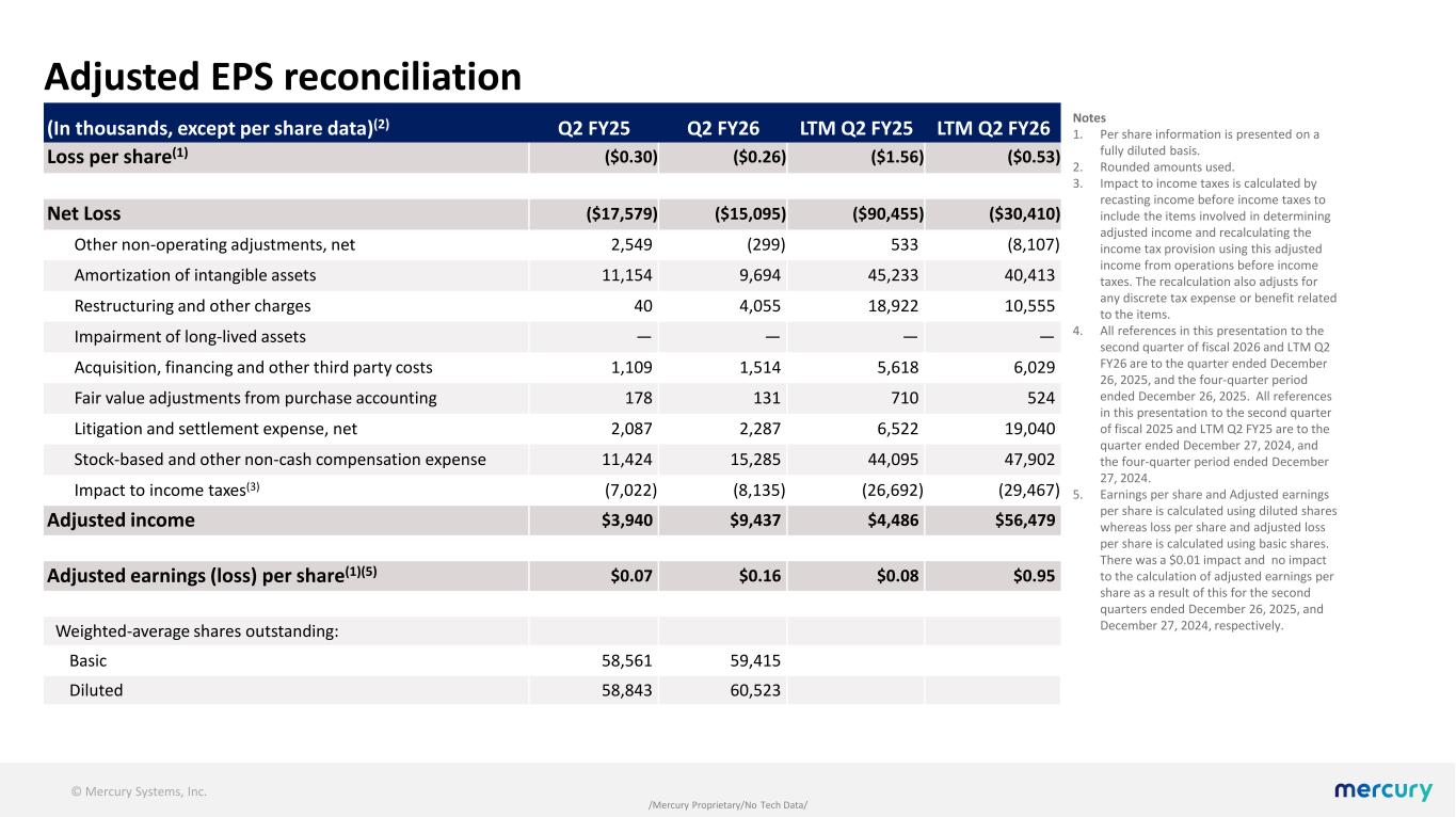 © Mercury Systems, Inc. /Mercury Proprietary/No Tech Data/ Adjusted EPS reconciliation Notes 1. Per share information is presented on a fully diluted basis. 2. Rounded amounts used. 3. Impact to income taxes is calculated by recasting income before income taxes to include the items involved in determining adjusted income and recalculating the income tax provision using this adjusted income from operations before income taxes. The recalculation also adjusts for any discrete tax expense or benefit related to the items. 4. All references in this presentation to the second quarter of fiscal 2026 and LTM Q2 FY26 are to the quarter ended December 26, 2025, and the four-quarter period ended December 26, 2025. All references in this presentation to the second quarter of fiscal 2025 and LTM Q2 FY25 are to the quarter ended December 27, 2024, and the four-quarter period ended December 27, 2024. 5. Earnings per share and Adjusted earnings per share is calculated using diluted shares whereas loss per share and adjusted loss per share is calculated using basic shares. There was a $0.01 impact and no impact to the calculation of adjusted earnings per share as a result of this for the second quarters ended December 26, 2025, and December 27, 2024, respectively. (In thousands, except per share data)(2) Q2 FY25 Q2 FY26 LTM Q2 FY25 LTM Q2 FY26 Loss per share(1) ($0.30) ($0.26) ($1.56) ($0.53) Net Loss ($17,579) ($15,095) ($90,455) ($30,410) Other non-operating adjustments, net 2,549 (299) 533 (8,107) Amortization of intangible assets 11,154 9,694 45,233 40,413 Restructuring and other charges 40 4,055 18,922 10,555 Impairment of long-lived assets — — — — Acquisition, financing and other third party costs 1,109 1,514 5,618 6,029 Fair value adjustments from purchase accounting 178 131 710 524 Litigation and settlement expense, net 2,087 2,287 6,522 19,040 Stock-based and other non-cash compensation expense 11,424 15,285 44,095 47,902 Impact to income taxes(3) (7,022) (8,135) (26,692) (29,467) Adjusted income $3,940 $9,437 $4,486 $56,479 Adjusted earnings (loss) per share(1)(5) $0.07 $0.16 $0.08 $0.95 Weighted-average shares outstanding: Basic 58,561 59,415 Diluted 58,843 60,523
