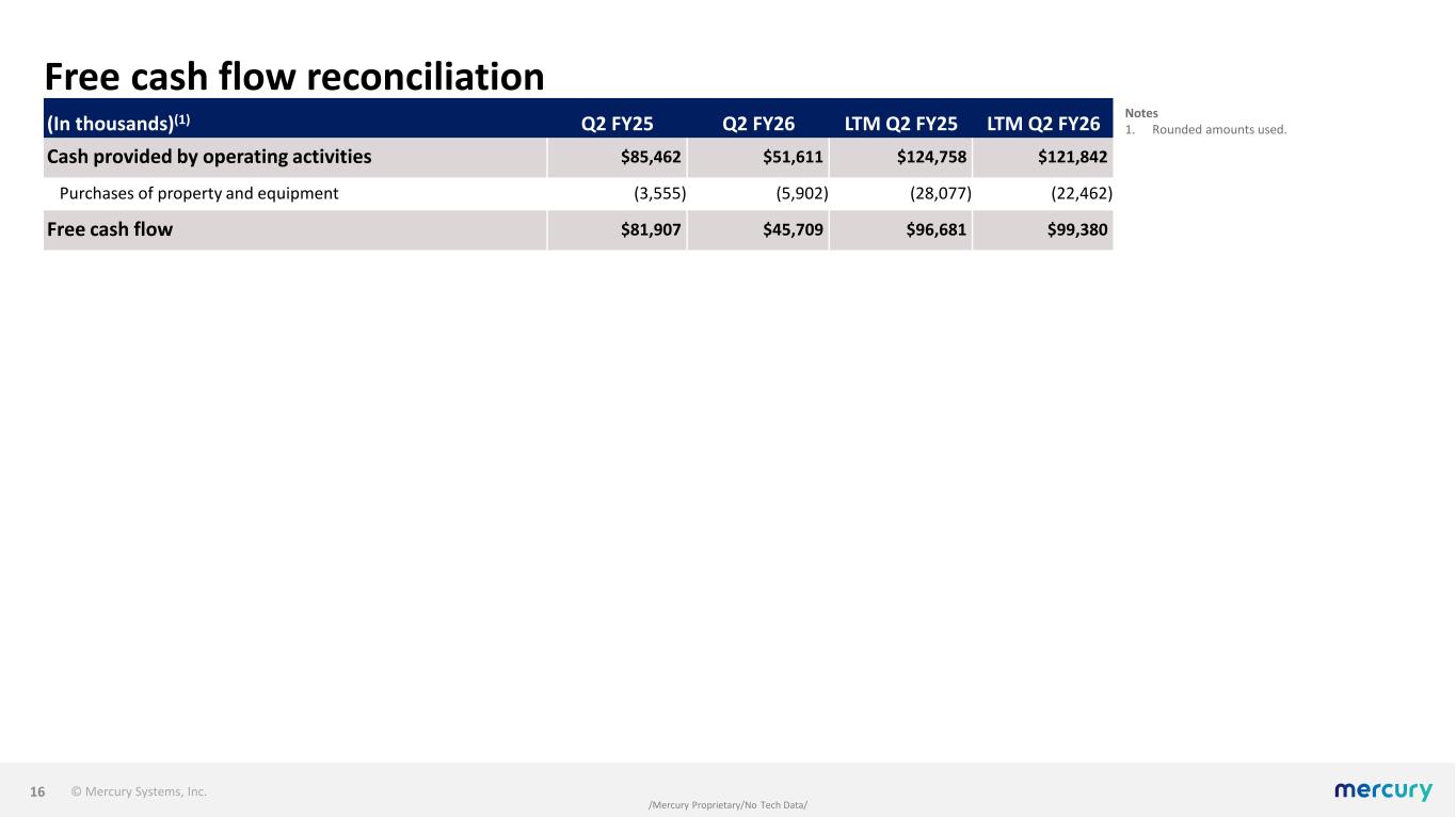 © Mercury Systems, Inc. /Mercury Proprietary/No Tech Data/ Adjusted EBITDA reconciliation 15 Notes 1. Rounded amounts used. 2. All references in this presentation to the second quarter of fiscal 2026 and LTM Q2 FY26 are to the quarter ended December 26, 2025, and the four- quarter period ended December 26, 2025. All references in this presentation to the second quarter of fiscal 2025 and LTM Q2 FY25 are to the quarter ended December 27, 2024, and the four- quarter period ended December 27, 2024. (In thousands)(1)(2) Q2 FY25 Q2 FY26 LTM Q2 FY25 LTM Q2 FY26 Net loss ($17,579) ($15,095) ($90,455) ($30,410) Other non-operating adjustments, net 2,549 (299) 533 (8,107) Interest expense, net 8,024 6,201 33,797 25,497 Income tax benefit (6,725) (2,364) (32,786) (6,586) Depreciation 9,768 8,606 40,054 36,685 Amortization of intangible assets 11,154 9,694 45,233 40,413 Restructuring and other charges 40 4,055 18,922 10,555 Impairment of long-lived assets — — — — Acquisition, financing and other third party costs 1,109 1,514 5,618 6,029 Fair value adjustments from purchase accounting 178 131 710 524 Litigation and settlement expense, net 2,087 2,287 6,522 19,040 Stock-based and other non-cash compensation expense 11,424 15,285 44,095 47,902 Adjusted EBITDA $22,029 $30,015 $72,243 $141,542