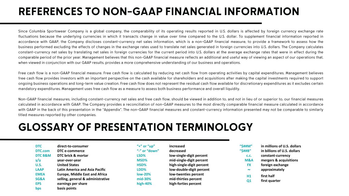 DTC DTC.com DTC B&M y/y U.S. LAAP EMEA SG&A EPS bps direct-to-consumer DTC e-commerce DTC brick & mortar year-over-year United States Latin America and Asia Pacific Europe, Middle East and Africa selling, general & administrative earnings per share basis points “+” or “up” “-” or “down” LSD% MSD% HSD% LDD% low-20% mid-30% high-40% increased decreased low-single-digit percent mid-single-digit percent high-single-digit percent low-double-digit percent low-twenties percent mid-thirties percent high-forties percent “$##M” “$##B” c.c. M&A FX ~ H1 Q1 in millions of U.S. dollars in billions of U.S. dollars constant-currency mergers & acquisitions foreign exchange approximately first half first quarter
