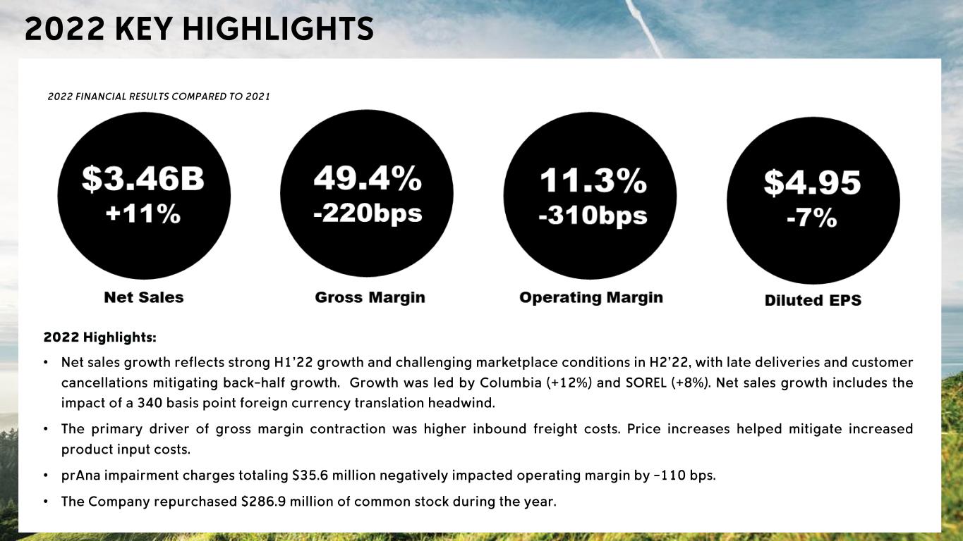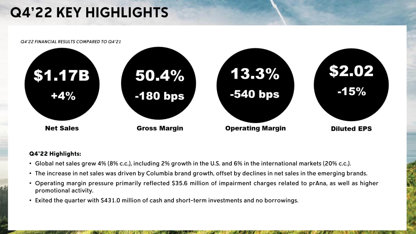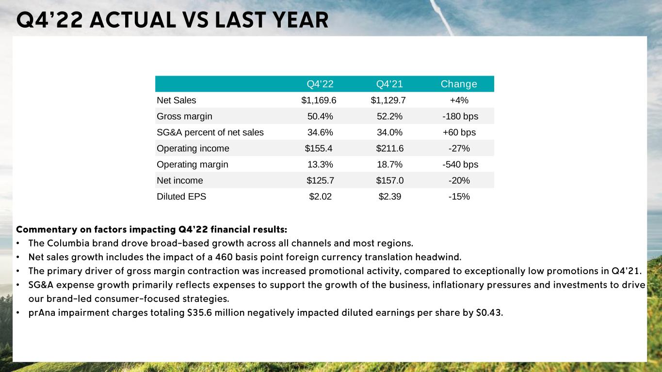 • • • • • Q4'22 Q4'21 Change Net Sales $1,169.6 $1,129.7 +4% Gross margin 50.4% 52.2% -180 bps SG&A percent of net sales 34.6% 34.0% +60 bps Operating income $155.4 $211.6 -27% Operating margin 13.3% 18.7% -540 bps Net income $125.7 $157.0 -20% Diluted EPS $2.02 $2.39 -15%