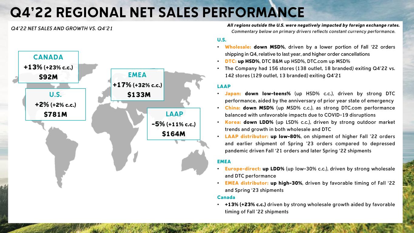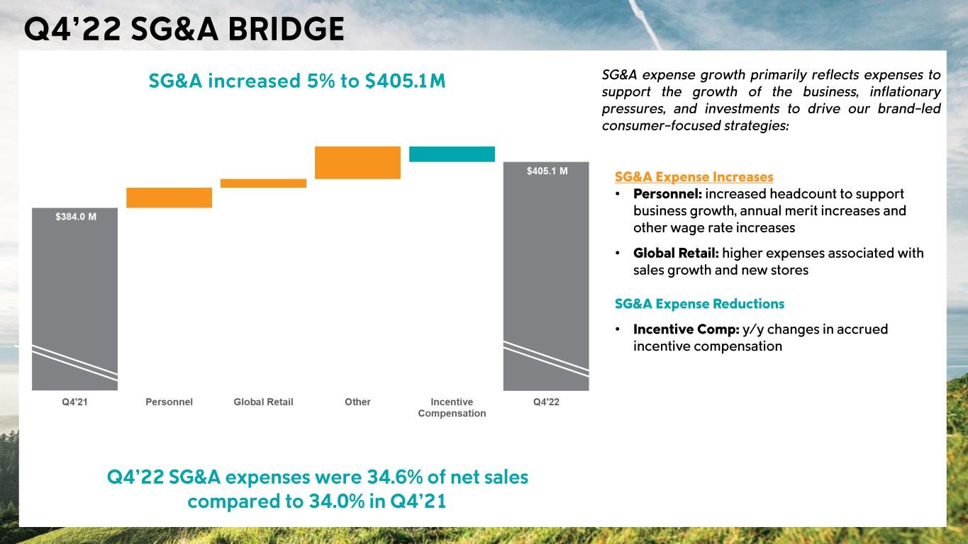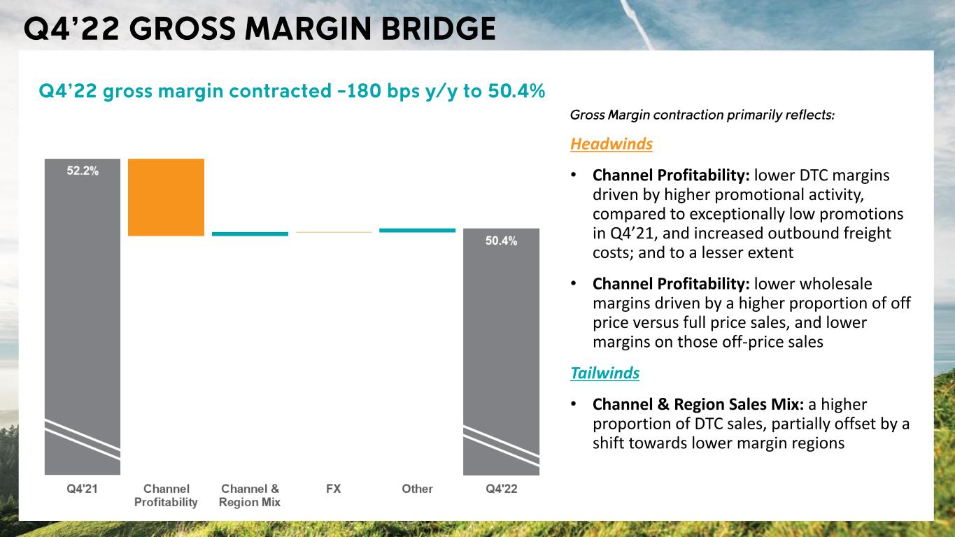Headwinds • Channel Profitability: lower DTC margins driven by higher promotional activity, compared to exceptionally low promotions in Q4’21, and increased outbound freight costs; and to a lesser extent • Channel Profitability: lower wholesale margins driven by a higher proportion of off price versus full price sales, and lower margins on those off-price sales Tailwinds • Channel & Region Sales Mix: a higher proportion of DTC sales, partially offset by a shift towards lower margin regions