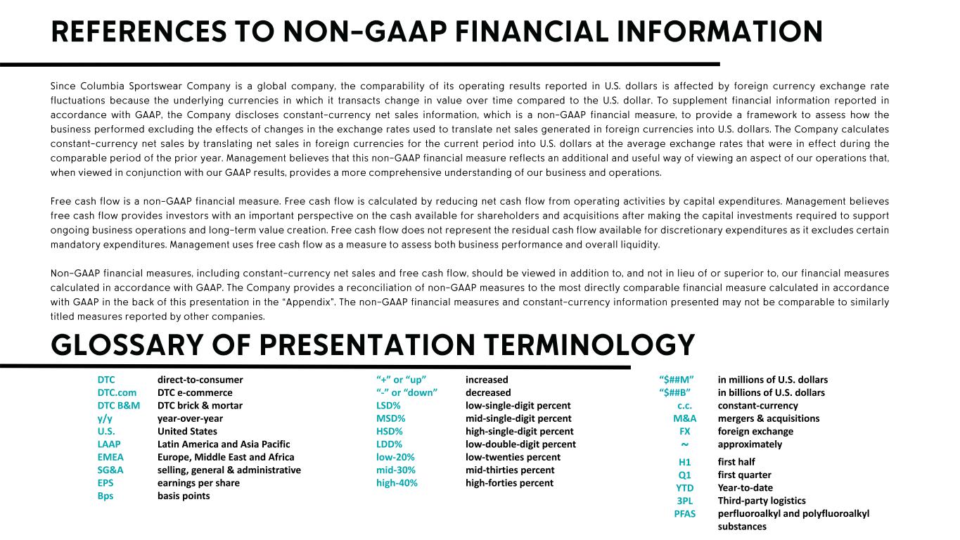 DTC DTC.com DTC B&M y/y U.S. LAAP EMEA SG&A EPS Bps direct-to-consumer DTC e-commerce DTC brick & mortar year-over-year United States Latin America and Asia Pacific Europe, Middle East and Africa selling, general & administrative earnings per share basis points “+” or “up” “-” or “down” LSD% MSD% HSD% LDD% low-20% mid-30% high-40% increased decreased low-single-digit percent mid-single-digit percent high-single-digit percent low-double-digit percent low-twenties percent mid-thirties percent high-forties percent “$##M” “$##B” c.c. M&A FX ~ H1 Q1 YTD 3PL PFAS in millions of U.S. dollars in billions of U.S. dollars constant-currency mergers & acquisitions foreign exchange approximately first half first quarter Year-to-date Third-party logistics perfluoroalkyl and polyfluoroalkyl substances