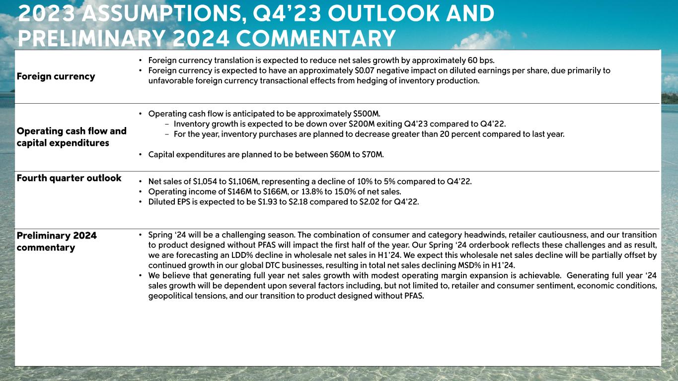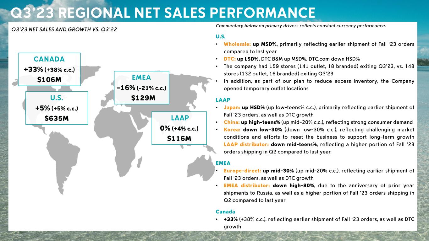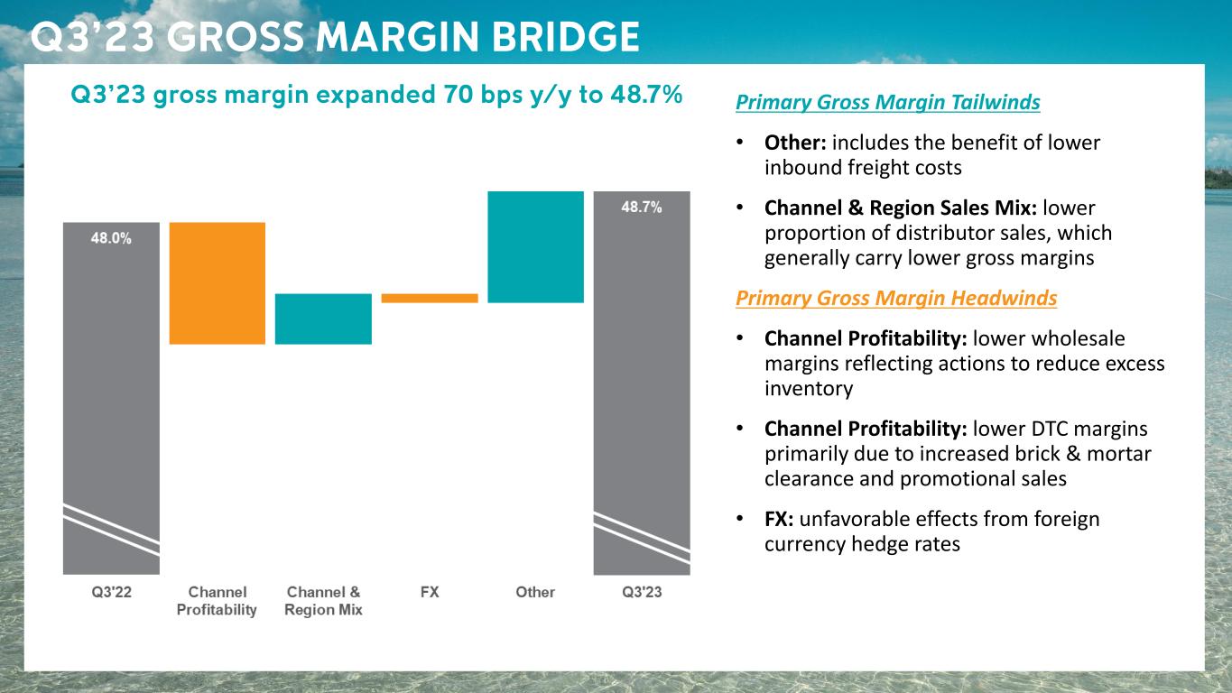 Primary Gross Margin Tailwinds • Other: includes the benefit of lower inbound freight costs • Channel & Region Sales Mix: lower proportion of distributor sales, which generally carry lower gross margins Primary Gross Margin Headwinds • Channel Profitability: lower wholesale margins reflecting actions to reduce excess inventory • Channel Profitability: lower DTC margins primarily due to increased brick & mortar clearance and promotional sales • FX: unfavorable effects from foreign currency hedge rates