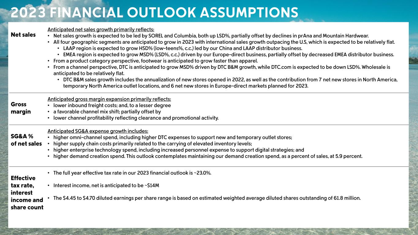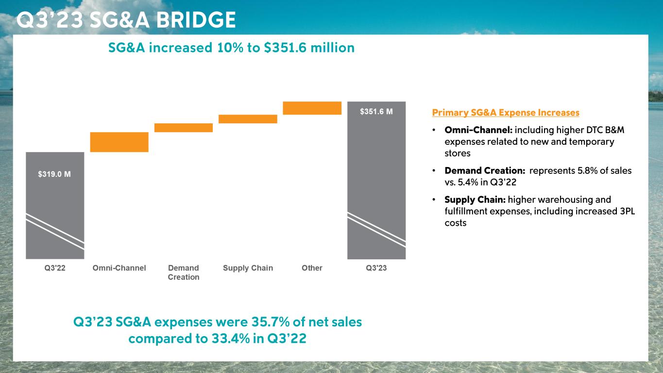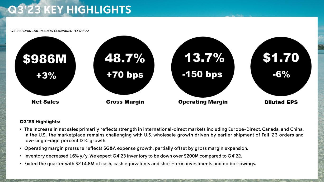 Primary Gross Margin Tailwinds • Other: includes the benefit of lower inbound freight costs • Channel & Region Sales Mix: lower proportion of distributor sales, which generally carry lower gross margins Primary Gross Margin Headwinds • Channel Profitability: lower wholesale margins reflecting actions to reduce excess inventory • Channel Profitability: lower DTC margins primarily due to increased brick & mortar clearance and promotional sales • FX: unfavorable effects from foreign currency hedge rates