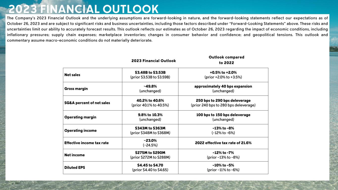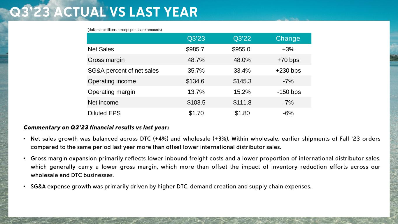 • • • (dollars in millions, except per share amounts) Q3'23 Q3'22 Change Net Sales $985.7 $955.0 +3% Gross margin 48.7% 48.0% +70 bps SG&A percent of net sales 35.7% 33.4% +230 bps Operating income $134.6 $145.3 -7% Operating margin 13.7% 15.2% -150 bps Net income $103.5 $111.8 -7% Diluted EPS $1.70 $1.80 -6%