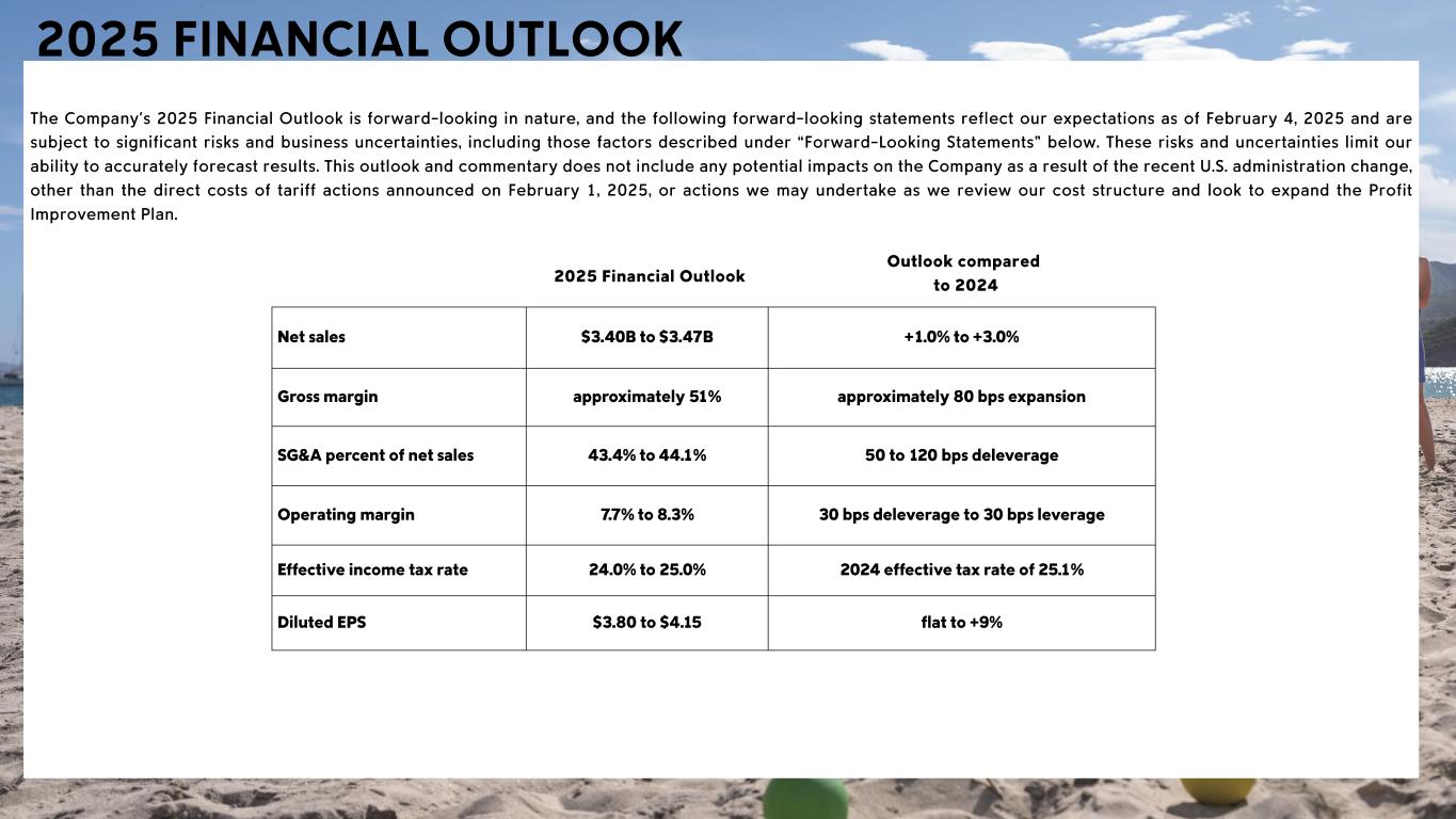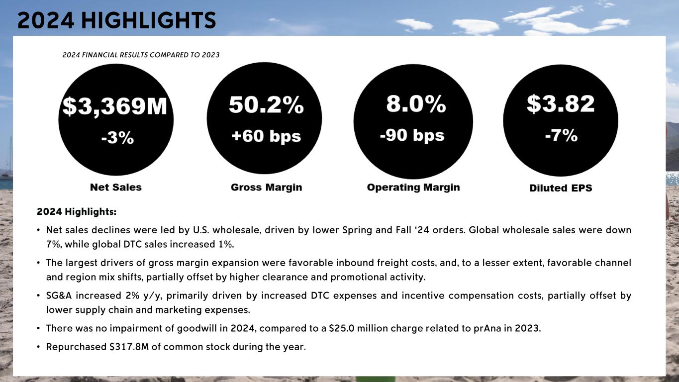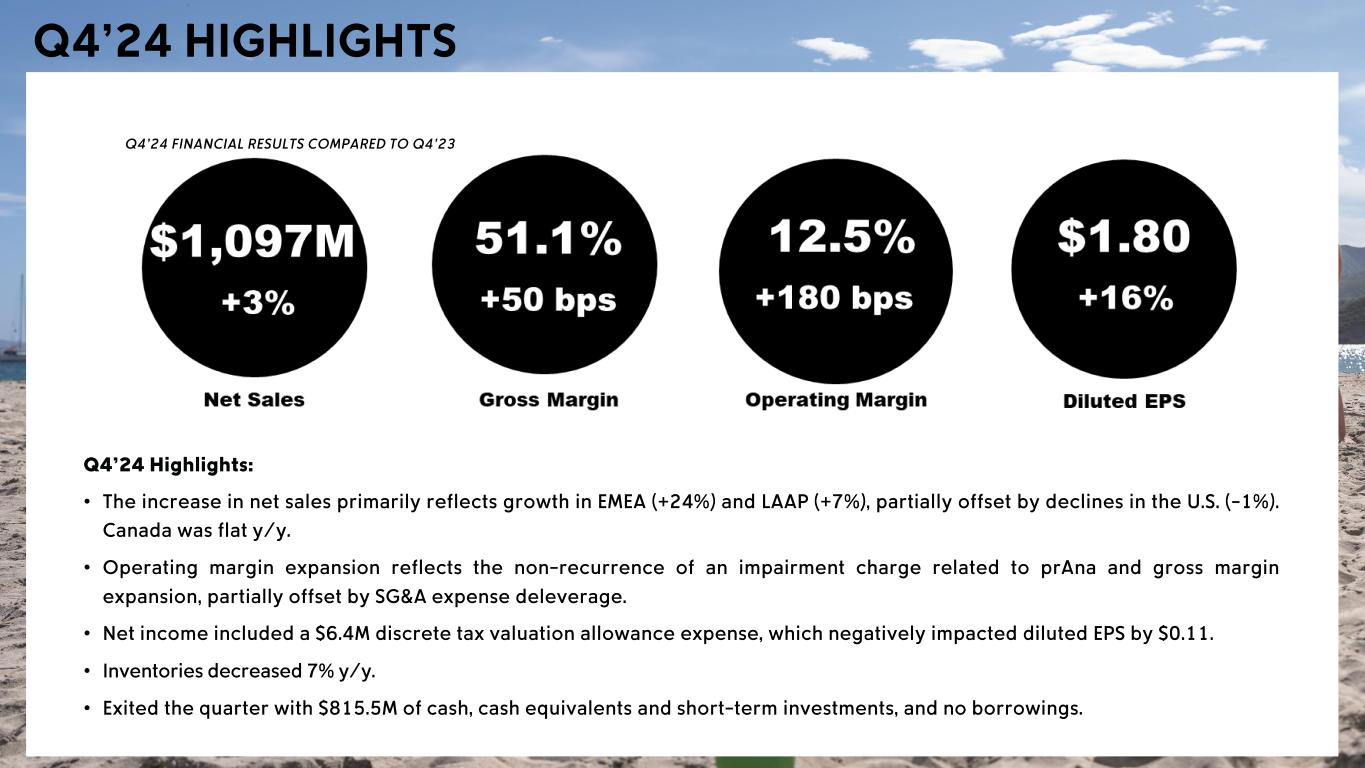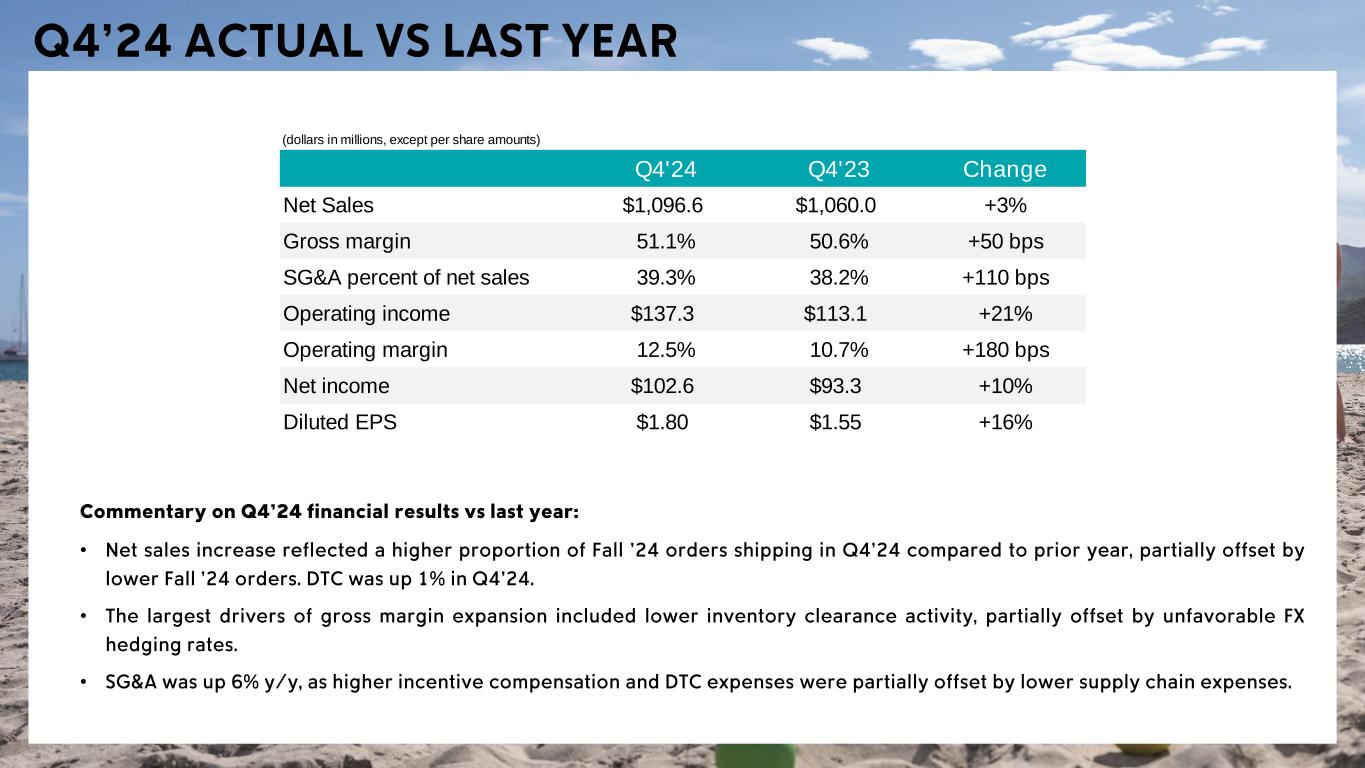 • • • (dollars in millions, except per share amounts) Q4'24 Q4'23 Change Net Sales $1,096.6 $1,060.0 +3% Gross margin 51.1% 50.6% +50 bps SG&A percent of net sales 39.3% 38.2% +110 bps Operating income $137.3 $113.1 +21% Operating margin 12.5% 10.7% +180 bps Net income $102.6 $93.3 +10% Diluted EPS $1.80 $1.55 +16%