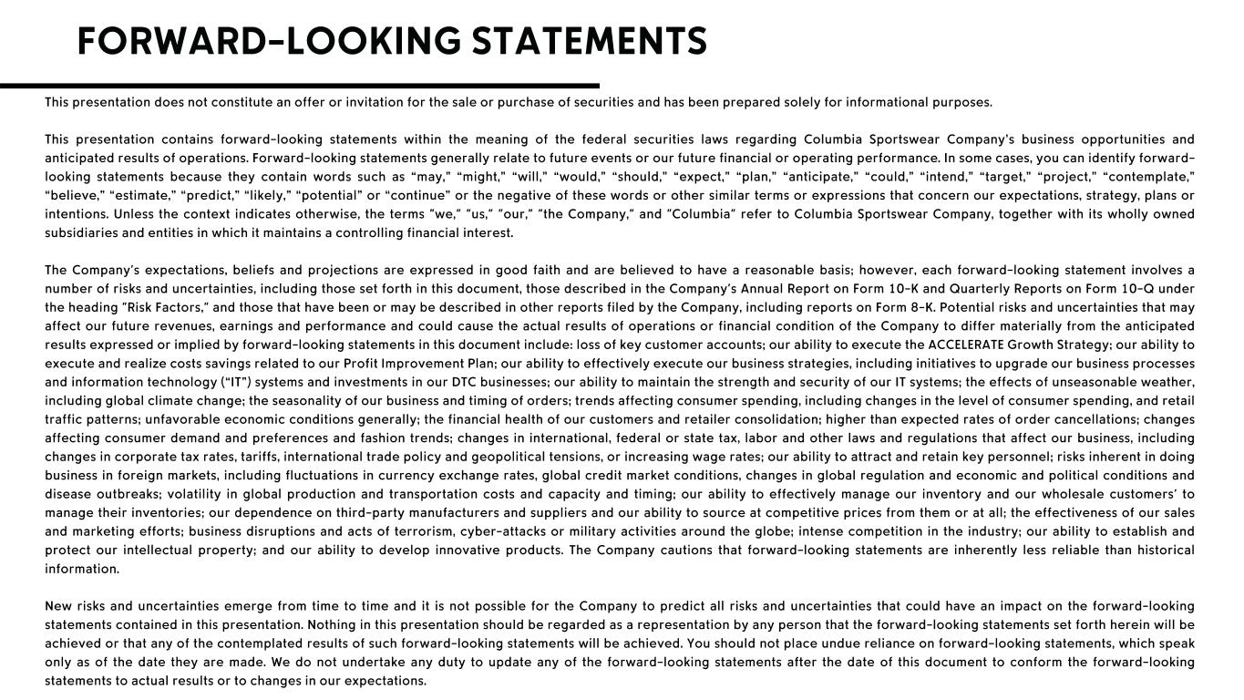 DTC DTC.com DTC B&M y/y U.S. LAAP EMEA SG&A EPS bps direct-to-consumer DTC e-commerce DTC brick & mortar year-over-year United States Latin America and Asia Pacific Europe, Middle East and Africa selling, general & administrative earnings per share basis points “+” or “up” “-” or “down” LSD% MSD% HSD% LDD% low-20% mid-30% high-40% increased decreased low-single-digit percent mid-single-digit percent high-single-digit percent low-double-digit percent low-twenties percent mid-thirties percent high-forties percent “$##M” “$##B” c.c. M&A FX ~ H# Q# YTD in millions of U.S. dollars in billions of U.S. dollars constant-currency mergers & acquisitions foreign currency exchange approximately First half, second half Quarter 1, 2, 3, 4 Year-to-date