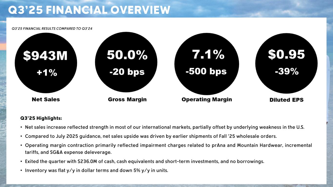CSC Confidential – Sensitive Information Q3’25 FINANCIAL OVERVIEW Q 3 ’25 FINANCIAL RESULTS COMPARED TO Q 3 ’24 Q 3 ’25 Highlights : • Net sales increase reflected strength in most of our international markets, partially offset by underlying weakness in the U.S. • Compared to July 2025 guidance, net sales upside was driven by earlier shipments of Fall ’25 wholesale orders . • Operating margin contraction primarily reflected impairment charges related to prAna and Mountain Hardwear, incremental tariffs, and SG&A expense deleverage . • Exited the quarter with $236 .0M of cash, cash equivalents and short - term investments, and no borrowings . • Inventory was flat y/y in dollar terms and down 5% y/y in units .