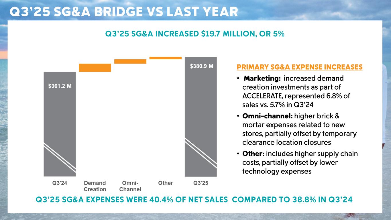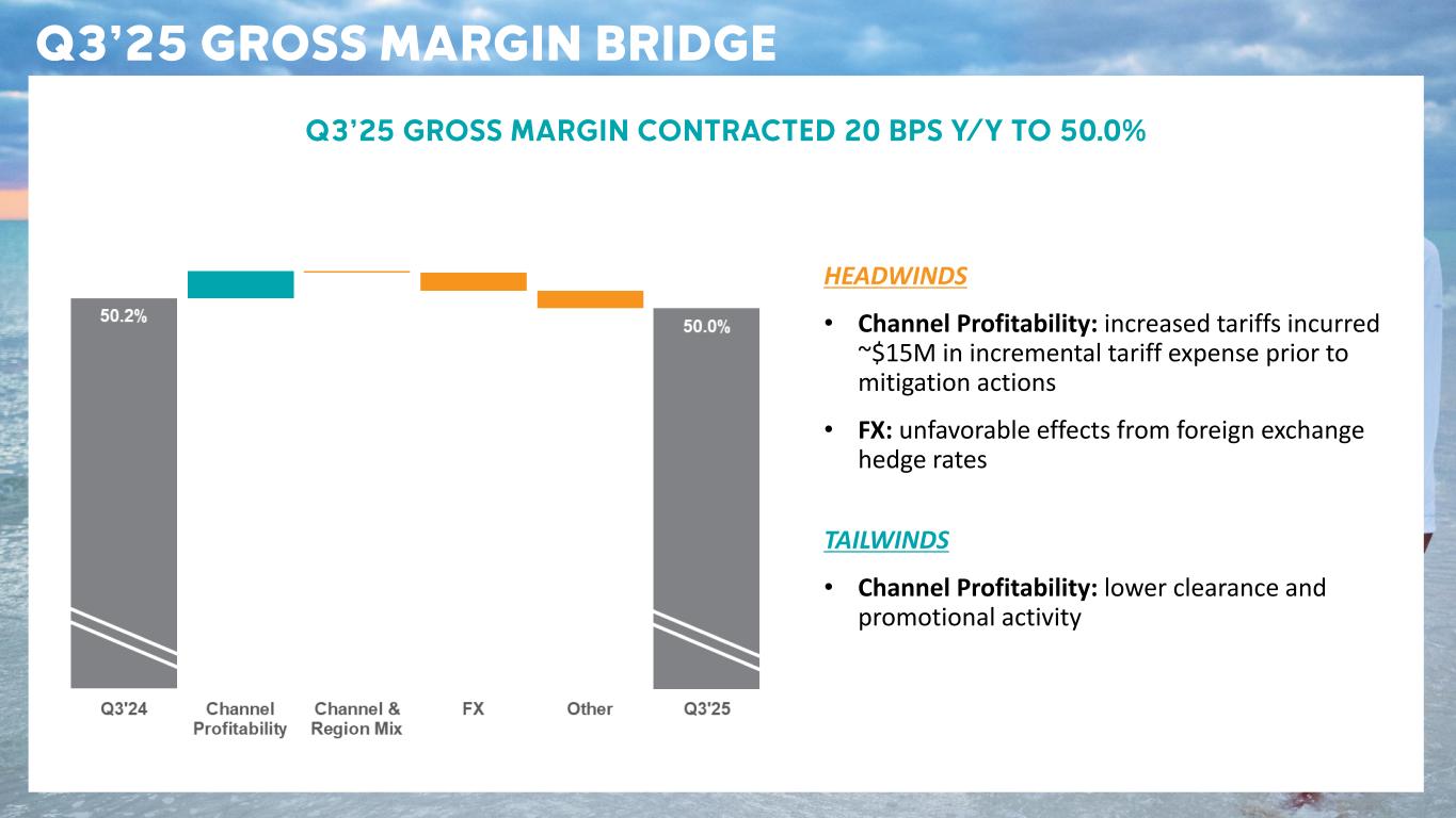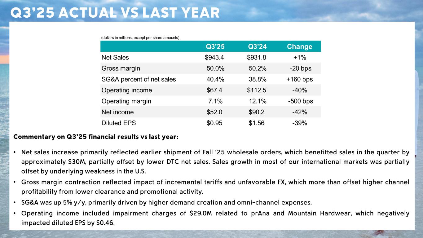 CSC Confidential – Sensitive Information Q3’25 ACTUAL VS LAST YEAR Commentary on Q 3 ’25 financial results vs last year : • Net sales increase primarily reflected earlier shipment of Fall ‘25 wholesale orders, which benefitted sales in the quarter by approximately $30 M, partially offset by lower DTC net sales . Sales growth in most of our international markets was partially offset by underlying weakness in the U.S. • Gross margin contraction reflected impact of incremental tariffs and unfavorable FX, which more than offset higher channel profitability from lower clearance and promotional activity . • SG&A was up 5% y/y, primarily driven by higher demand creation and omni - channel expenses . • Operating income included impairment charges of $29 .0M related to prAna and Mountain Hardwear, which negatively impacted diluted EPS by $0.46 . (dollars in millions, except per share amounts) Q3'25 Q3'24 Change Net Sales $943.4 $931.8 +1% Gross margin 50.0% 50.2% -20 bps SG&A percent of net sales 40.4% 38.8% +160 bps Operating income $67.4 $112.5 -40% Operating margin 7.1% 12.1% -500 bps Net income $52.0 $90.2 -42% Diluted EPS $0.95 $1.56 -39%