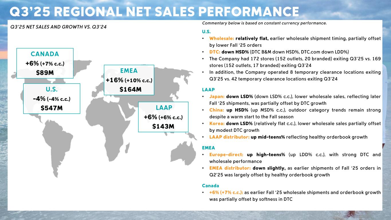 CSC Confidential – Sensitive Information Q3’25 REGIONAL NET SALES PERFORMANCE Commentary below is based on constant currency performance . U.S. • Wholesale : relatively flat, earlier wholesale shipment timing, partially offset by lower Fall ‘25 orders • DTC : down HSD % (DTC B&M down HSD %, DTC .com down LDD %) • The Company had 172 stores (152 outlets, 20 branded) exiting Q 3 ’25 vs . 169 stores (152 outlets, 17 branded) exiting Q 3 ’24 • In addition, the Company operated 8 temporary clearance locations exiting Q 3 ’25 vs . 42 temporary clearance locations exiting Q 3 ’24 LAAP • Japan : down LSD % (down LSD % c .c .), lower wholesale sales, reflecting later Fall ‘25 shipments, was partially offset by DTC growth • China : up HSD % (up MSD% c .c .), outdoor category trends remain strong despite a warm start to the Fall season • Korea : down LSD % (relatively flat c .c .), lower wholesale sales partially offset by modest DTC growth • LAAP distributor : up mid - teens % reflecting healthy orderbook growth EMEA • Europe - direct : up high - teens % (up LDD % c .c .), with strong DTC and wholesale performance • EMEA distributor : down slightly, as earlier shipments of Fall ‘25 orders in Q 2 ’25 was largely offset by healthy orderbook growth Canada • +6 % (+7 % c .c .): as earlier Fall ‘25 wholesale shipments and orderbook growth was partially offset by softness in DTC Q 3 ’25 NET SALES AND GROWTH VS . Q 3 ’24 CANADA +6% (+7% c.c.) $89M U.S. - 4% (- 4% c.c.) $547M EMEA +16 % (+10 % c.c.) $164M LAAP +6% (+6% c.c.) $143M
