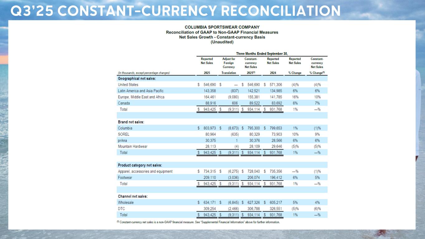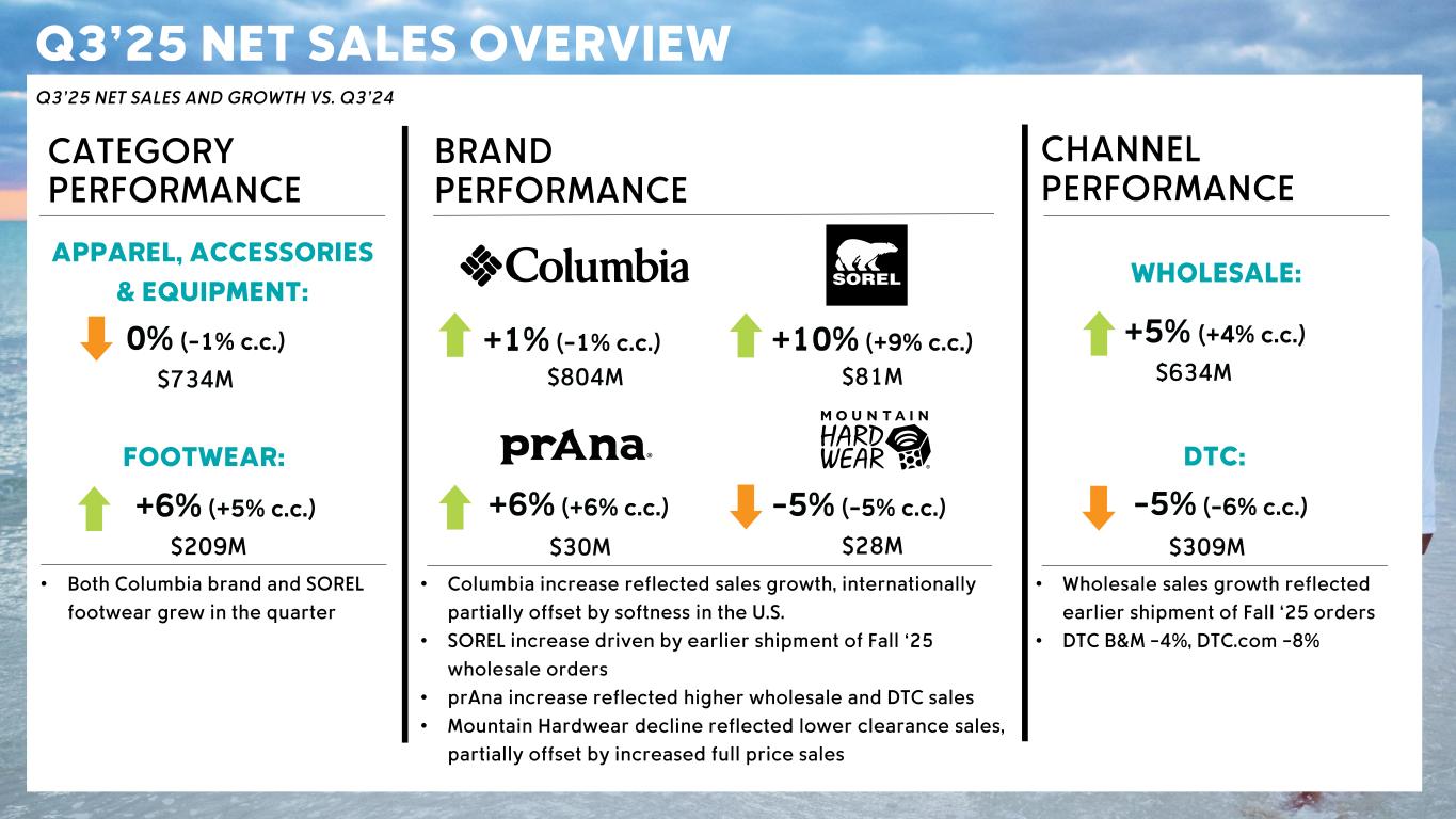 CSC Confidential – Sensitive Information Q3’25 NET SALES OVERVIEW Q 3 ’25 NET SALES AND GROWTH VS . Q 3 ’24 CATEGORY PERFORMANCE CHANNEL PERFORMANCE WHOLESALE: DTC: - 5 % (- 6 % c.c .) $63 4M $309 M +5 % (+4 % c.c .) • Both Columbia brand and SOREL footwear grew in the quarter • Columbia increase reflected sales growth, internationally partially offset by softness in the U.S. • SOREL increase driven by earlier shipment of Fall ‘25 wholesale orders • prAna increase reflected higher wholesale and DTC sales • Mountain Hardwear decline reflected lower clearance sales, partially offset by increased full price sales • Wholesale sales growth reflected earlier shipment of Fall ‘25 orders • DTC B&M - 4%, DTC.com - 8% APPAREL, ACCESSORIES & EQUIPMENT: $734M 0 % (- 1 % c.c .) FOOTWEAR: +6 % (+5 % c.c .) $209 M BRAND PERFORMANCE +1 % (- 1 % c.c .) $804M +10 % (+9 % c.c .) $81 M +6 % (+6 % c.c .) $30M - 5 % (- 5 % c.c .) $28M