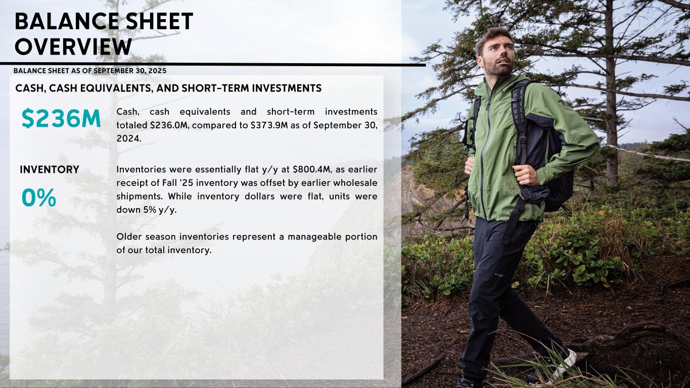 BALANCE SHEET OVERVIEW Cash, cash equivalents and short - term investments totaled $236 .0M, compared to $373 .9M as of September 30 , 2024 . $236 M 0% BALANCE SHEET AS OF SEPTEMBER 30 , 2025 INVENTORY CASH, CASH EQUIVALENTS, AND SHORT - TERM INVESTMENTS Inventories were essentially flat y/y at $800 .4M, as earlier receipt of Fall ’25 inventory was offset by earlier wholesale shipments . While inventory dollars were flat, units were down 5% y/y . Older season inventories represent a manageable portion of our total inventory .