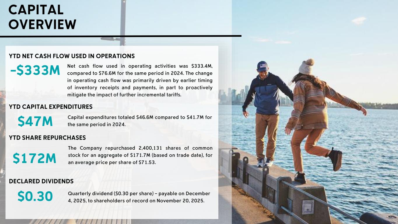 CAPITAL OVERVIEW - $333M Net cash flow used in operating activities was $333 .4M, compared to $76 .6M for the same period in 2024 . The change in operating cash flow was primarily driven by earlier timing of inventory receipts and payments, in part to proactively mitigate the impact of further incremental tariffs . Capital expenditures totaled $46 .6M compared to $41 .7M for the same period in 2024 . $1 72M The Company repurchased 2 ,400 ,131 shares of common stock for an aggregate of $171 .7M (based on trade date), for an average price per share of $71 .53 . YTD SHARE REPURCHASES YTD CAPITAL EXPENDITURES YTD NET CASH FLOW USED IN OPERATIONS $0.30 Quarterly dividend ($0.30 per share) – payable on December 4, 2025, to shareholders of record on November 20, 2025. DECLARED DIVIDENDS $47M