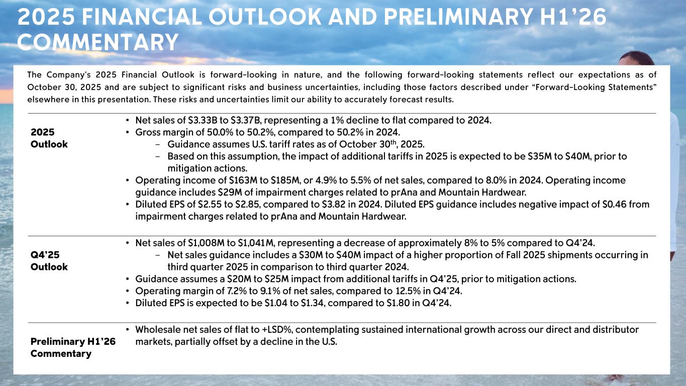 CSC Confidential – Sensitive Information 2025 FINANCIAL OUTLOOK AND PRELIMINARY H1’26 COMMENTARY The Company's 2025 Financial Outlook is forward - looking in nature, and the following forward - looking statements reflect our expectations as of October 30 , 2025 and are subject to significant risks and business uncertain ties, including those factors described under “Forward - Looking Statements” elsewhere in this presentation . These risks and uncertainties limit our ability to accurately forecast results . 2025 Outlook • Net sales of $3.33B to $3.37B, representing a 1% decline to flat compared to 2024. • Gross margin of 50.0% to 50.2%, compared to 50.2% in 2024. - Guidance assumes U.S. tariff rates as of October 30 th, 2025 . - Based on this assumption, the impact of additional tariffs in 2025 is expected to be $35M to $40M, prior to mitigation actions. • Operating income of $163M to $185M, or 4.9% to 5.5% of net sales, compared to 8.0% in 2024. Operating income guidance includes $29M of impairment charges related to prAna and Mountain Hardwear. • Diluted EPS of $2.55 to $2.85, compared to $3.82 in 2024. Diluted EPS guidance includes negative impact of $0.46 from impairment charges related to prAna and Mountain Hardwear. Q4’25 Outlook • Net sales of $1,008M to $1,041M, representing a decrease of approximately 8% to 5% compared to Q4’24. - Net sales guidance includes a $30M to $40M impact of a higher proportion of Fall 2025 shipments occurring in third quarter 2025 in comparison to third quarter 2024. • Guidance assumes a $20M to $25M impact from additional tariffs in Q4’25, prior to mitigation actions. • Operating margin of 7.2% to 9.1% of net sales, compared to 12.5% in Q4’24. • Diluted EPS is expected to be $1.04 to $1.34, compared to $1.80 in Q4’24. Preliminary H1’26 Commentary • Wholesale net sales of flat to +LSD%, contemplating sustained international growth across our direct and distributor markets, partially offset by a decline in the U.S.