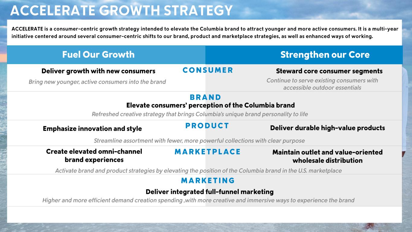 CSC Confidential – Sensitive Information ACCELERATE GROWTH STRATEGY MARKETPLACECreate elevated omni - channel brand experiences Maintain outlet and value - oriented wholesale distribution Activate brand and product strategies by elevating the position of the Columbia brand in the U.S. m arketplace PRODUCTEmphasize innovation and style Deliver durable high - value products Streamline assortment with fewer, more powerful collections with clear purpose BRAND CONSUMER Fuel Our Growth Strengthen our Core Elevate consumers’ perception of the Columbia brand Refreshed creative strategy that brings Columbia’s unique brand personality to life Deliver growth with new consumers Bring new younger, active consumers into the brand Steward core consumer segments Continue to serve existing consumers with accessible outdoor essentials MARKETING Deliver integrated full - funnel marketing Higher and more efficient demand creation spending ,with more creative and immersive ways to experience the brand ACCELERATE is a consumer - centric growth strategy intended to elevate the Columbia brand to attract younger and more active consumers . It is a multi - year initiative centered around several consumer - centric shifts to our brand, product and marketplace strategies, as well as enhanced ways of working .