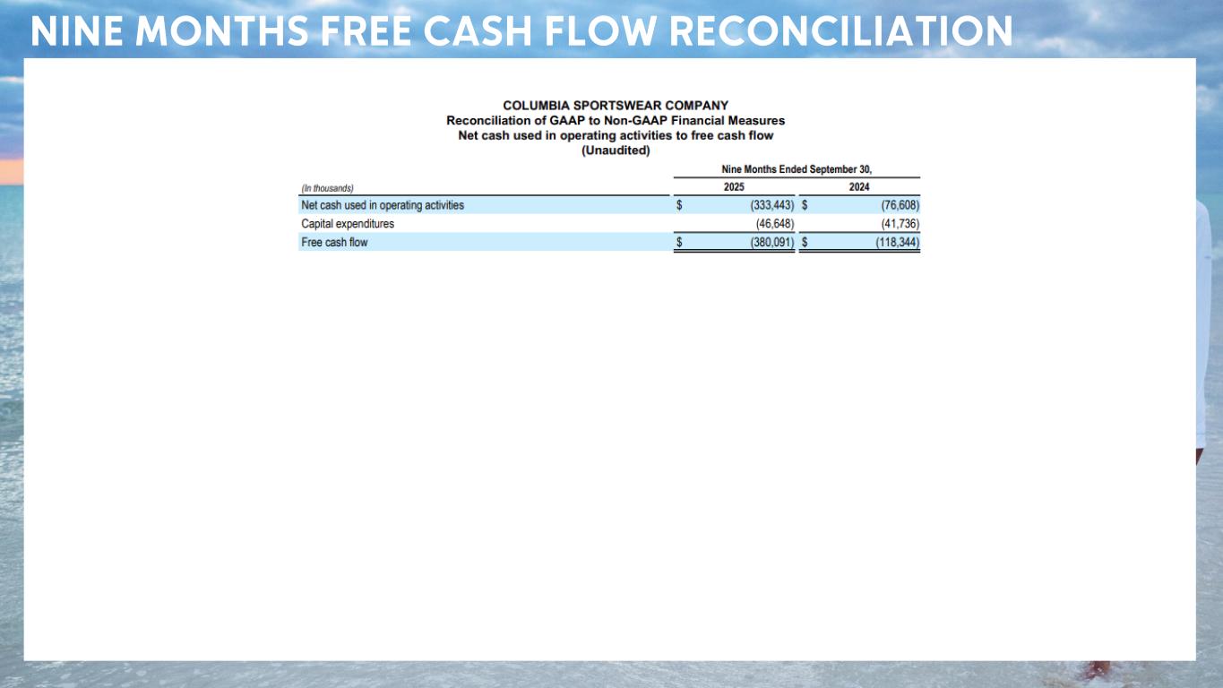 Since Columbia Sportswear Company is a global company, the comparability of its operating results reported in U.S. dollars is affected by foreign currency exchange rate fluctuations because the underlying currencies in which it transacts change in value over time compared to the U.S. dollar . To supplement financial information reported in accordance with GAAP, the Company discloses constant - currency net sales information, which is a non - GAAP financial measure, to provide a framework to assess how the business performed excluding the effects of changes in the exchange rates used to translate net sales generated in foreign currencies into U.S. dollars . The Company calculates constant - currency net sales by translating net sales in foreign currencies for the current period into U.S. dollars at the average exchange rates that were in effect during the comparable period of the prior year . Management believes that this non - GAAP financial measure reflects an additional and useful way of viewing an aspect of our operations that, when viewed in conjunction with our GAAP results, provides a more comprehensive understanding of our business and operations . Free cash flow is a non - GAAP financial measure . Free cash flow is calculated by reducing net cash flow from operating activities by capital expenditures . Management believes free cash flow provides investors with an important perspective on the cash available for shareholders and acquisitions after making the capital investments required to support ongoing business operations and long - term value creation . Free cash flow does not represent the residual cash flow available for discretionary expenditures as it excludes certain mandatory expenditures . Management uses free cash flow as a measure to assess both business performance and overall liquidity . Non - GAAP financial measures, including constant - currency net sales and free cash flow, should be viewed in addition to, and not in lieu of or superior to, our financial measures calculated in accordance with GAAP . The Company provides a reconciliation of non - GAAP measures to the most directly comparable financial measure calculated in accordance with GAAP in the back of this presentation in the “Appendix” . The non - GAAP financial measures and constant - currency information presented may not be comparable to similarly titled measures reported by other companies . REFERENCES TO NON - GAAP FINANCIAL INFORMATION GLOSSARY OF PRESENTATION TERMINOLOGY DTC DTC.com DTC B&M y/y U.S. LAAP EMEA SG&A EPS bps direct-to-consumer DTC e-commerce DTC brick & mortar year-over-year United States Latin America and Asia Pacific Europe, Middle East and Africa selling, general & administrative earnings per share basis points “+” or “up” “-” or “down” LSD% MSD% HSD% LDD% low-20% mid-30% high-40% increased decreased low-single-digit percent mid-single-digit percent high-single-digit percent low-double-digit percent low-twenties percent mid-thirties percent high-forties percent “$##M” “$##B” c.c. M&A FX ~ H# Q# YTD in millions of U.S. dollars in billions of U.S. dollars constant-currency mergers & acquisitions foreign currency exchange approximately First half, second half Quarter 1, 2, 3, 4 Year-to-date