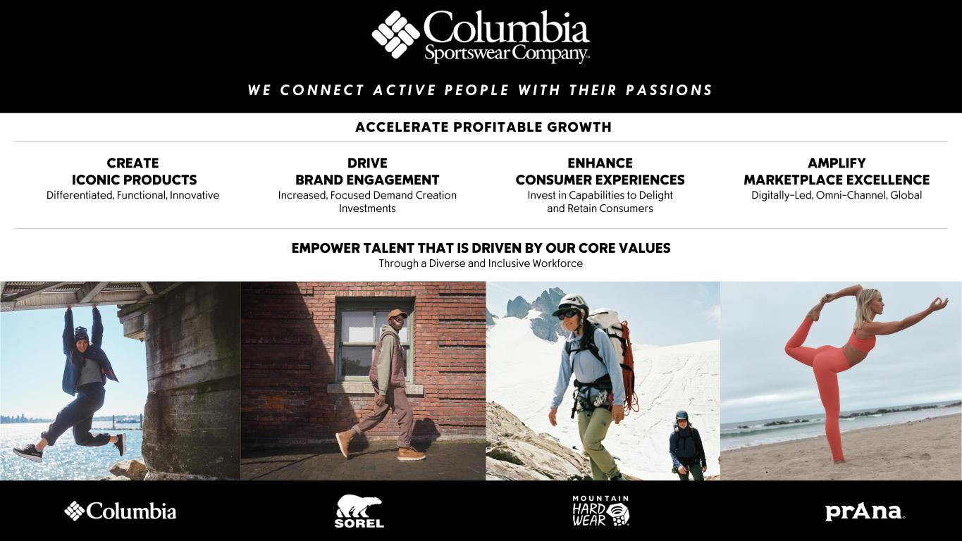 CSC Confidential – Sensitive Information ACCELERATE GROWTH STRATEGY MARKETPLACECreate elevated omni - channel brand experiences Maintain outlet and value - oriented wholesale distribution Activate brand and product strategies by elevating the position of the Columbia brand in the U.S. m arketplace PRODUCTEmphasize innovation and style Deliver durable high - value products Streamline assortment with fewer, more powerful collections with clear purpose BRAND CONSUMER Fuel Our Growth Strengthen our Core Elevate consumers’ perception of the Columbia brand Refreshed creative strategy that brings Columbia’s unique brand personality to life Deliver growth with new consumers Bring new younger, active consumers into the brand Steward core consumer segments Continue to serve existing consumers with accessible outdoor essentials MARKETING Deliver integrated full - funnel marketing Higher and more efficient demand creation spending ,with more creative and immersive ways to experience the brand ACCELERATE is a consumer - centric growth strategy intended to elevate the Columbia brand to attract younger and more active consumers . It is a multi - year initiative centered around several consumer - centric shifts to our brand, product and marketplace strategies, as well as enhanced ways of working . 2025 was an important milestone in this journey . The Columbia brand launched its new brand platform “Engineered for Whatever” through a global brand campaign in print, on social, and in - person . The Columbia brand also released certain new products designed with a younger, more active consumer in mind, and re - launched the U.S. Columbia .com website, with enhanced features and photography . We’re encouraged with early indicators, which signal that our differentiated marketing communications and enhanced products are resonating with consumers, providing us confidence as we plan for future seasons .