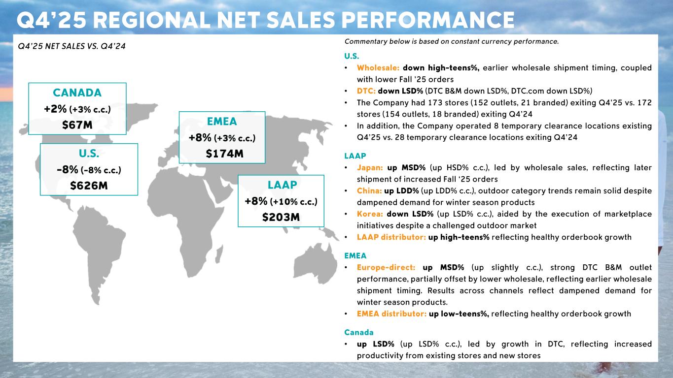 CSC Confidential – Sensitive Information Q4’25 REGIONAL NET SALES PERFORMANCE Commentary below is based on constant currency performance . U.S. • Wholesale : down high - teens %, earlier wholesale shipment timing, coupled with lower Fall ’25 orders • DTC : down LSD % (DTC B&M down LSD %, DTC .com down LSD %) • The Company had 173 stores (152 outlets, 21 branded) exiting Q 4 ’25 vs . 172 stores (154 outlets, 18 branded) exiting Q 4 ’24 • In addition, the Company operated 8 temporary clearance locations existing Q 4 ’25 vs . 28 temporary clearance locations exiting Q 4 ’24 LAAP • Japan : up MSD % (up HSD % c .c .), led by wholesale sales, reflecting later shipment of increased Fall ‘25 orders • China : up LDD % (up LDD % c .c .), outdoor category trends remain solid despite dampened demand for winter season products • Korea : down LSD % (up LSD % c .c .), aided by the execution of marketplace initiatives despite a challenged outdoor market • LAAP distributor : up high - teens % reflecting healthy orderbook growth EMEA • Europe - direct : up MSD % (up slightly c .c .), strong DTC B&M outlet performance, partially offset by lower wholesale, reflecting earlier wholesale shipment timing . Results across channels reflect dampened demand for winter season products . • EMEA distributor : up low - teens %, reflecting healthy orderbook growth Canada • up LSD % (up LSD % c .c .), led by growth in DTC, reflecting increased productivity from existing stores and new stores Q 4 ’25 NET SALES VS . Q 4 ’24 CANADA +2% (+3% c.c.) $67M U.S. - 8% (- 8% c.c.) $626M EMEA +8 % (+3% c.c.) $174M LAAP +8% (+10% c.c.) $203M