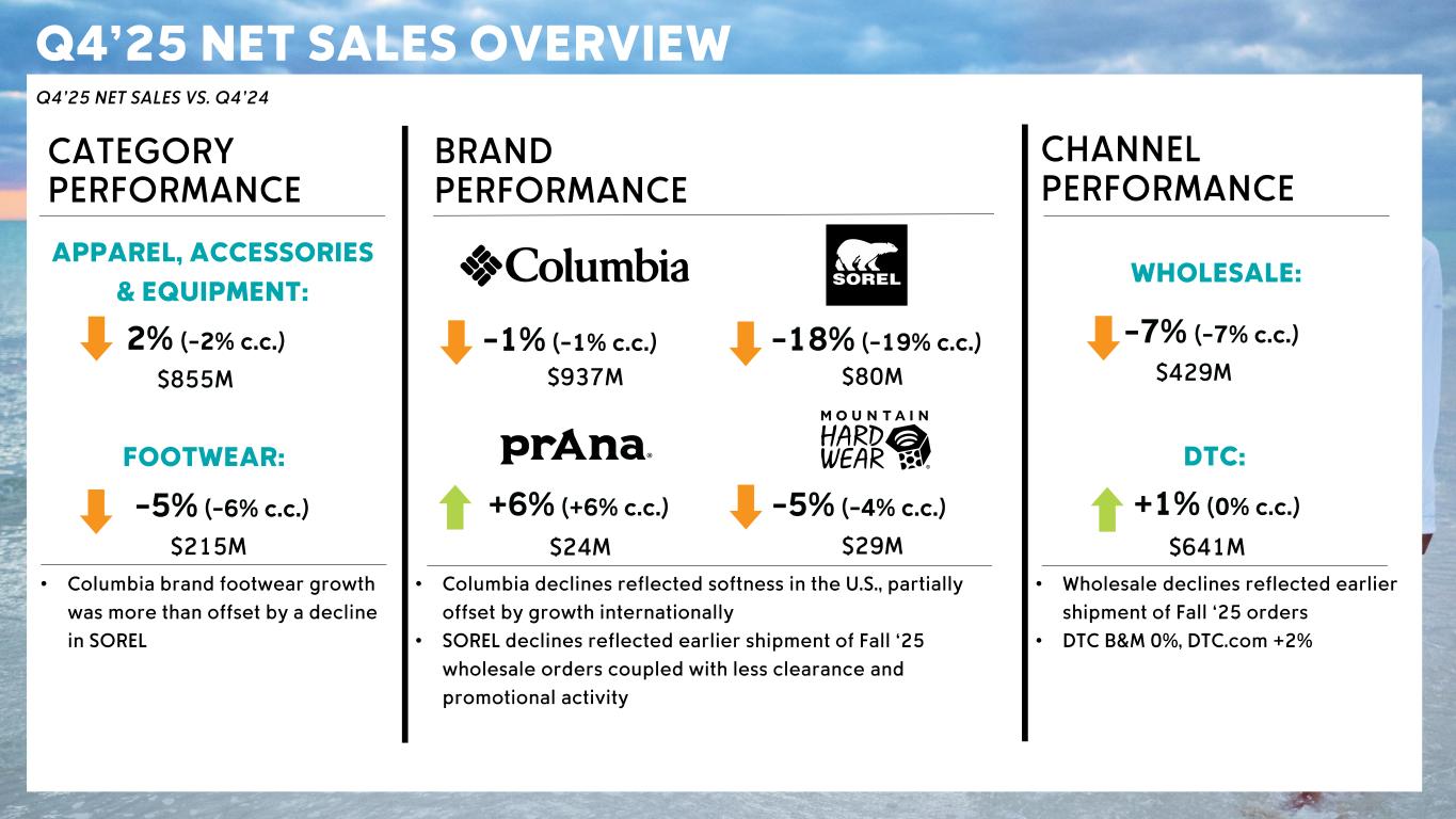 CSC Confidential – Sensitive Information Q4’25 NET SALES OVERVIEW Q 4 ’25 NET SALES VS . Q 4 ’24 CATEGORY PERFORMANCE CHANNEL PERFORMANCE WHOLESALE: DTC: +1 % (0 % c.c .) $429 M $641M - 7 % (- 7 % c.c .) • Columbia brand footwear growth was more than offset by a decline in SOREL • Columbia declines reflected softness in the U.S., partially offset by growth internationally • SOREL declines reflected earlier shipment of Fall ‘25 wholesale orders coupled with less clearance and promotional activity • Wholesale declines reflected earlier shipment of Fall ‘25 orders • DTC B&M 0% , DTC.com +2% APPAREL, ACCESSORIES & EQUIPMENT: $855 M 2 % (- 2 % c.c .) FOOTWEAR: - 5 % (- 6 % c.c .) $215 M BRAND PERFORMANCE - 1 % (- 1 % c.c .) $937 M - 1 8 % (- 19 % c.c .) $80 M +6 % (+6 % c.c .) $2 4M - 5 % (- 4 % c.c .) $29M