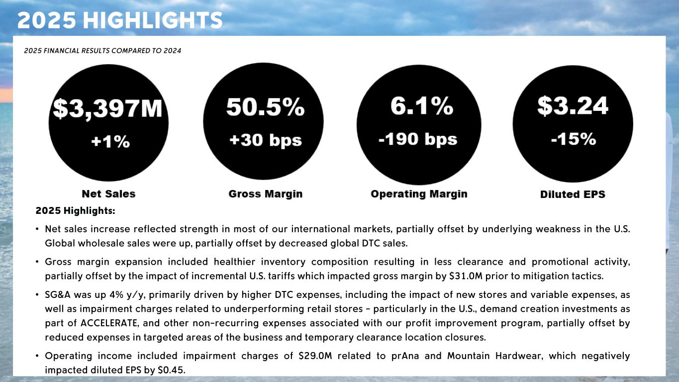 CSC Confidential – Sensitive Information 20 25 HIGHLIGHTS 20 25 Highlights : • Net sales increase reflected strength in most of our international markets, partially offset by underlying weakness in the U.S. Global wholesale sales were up, partially offset by decreased global DTC sales . • Gross margin expansion included healthier inventory composition resulting in less clearance and promotional activity, partially offset by the impact of incremental U.S. tariffs which impacted gross margin by $31 .0M prior to mitigation tactics . • SG&A was up 4% y/y, primarily driven by higher DTC expenses, including the impact of new stores and variable expenses, as well as impairment charges related to underperforming retail stores - particularly in the U.S., demand creation investments as part of ACCELERATE, and other non - recurring expenses associated with our profit improvement program, partially offset by reduced expenses in targeted areas of the business and temporary clearance location closures . • Operating income included impairment charges of $29 .0M related to prAna and Mountain Hardwear, which negatively impacted diluted EPS by $0.45 . 20 25 FINANCIAL RESULTS COMPARED TO 2024