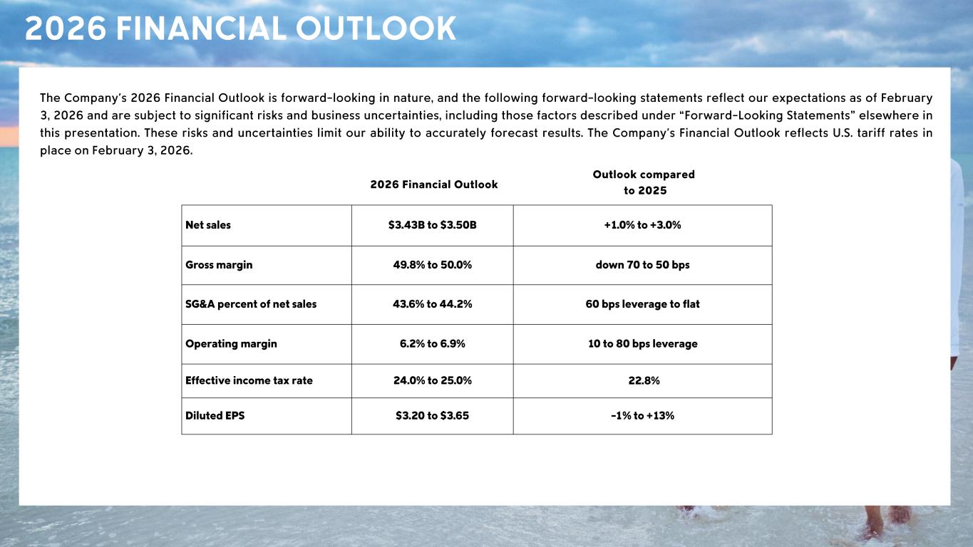 CSC Confidential – Sensitive Information 2026 FINANCIAL OUTLOOK The Company's 2026 Financial Outlook is forward - looking in nature, and the following forward - looking statements reflect our expectations as of February 3, 2026 and are subject to significant risks and business uncertain ties, including those factors described under “Forward - Looking Statements” elsewhere in this presentation . These risks and uncertainties limit our ability to accurately forecast results . The Company's Financial Outlook reflects U.S. tariff rates in place on February 3 , 2026 . Net sales $3.43B to $3.50B +1.0% to +3.0% Gross margin 49.8% to 50.0% down 70 to 50 bps SG&A percent of net sales 43.6% to 44.2% 60 bps leverage to flat Operating margin 6.2% to 6.9% 10 to 80 bps leverage Effective income tax rate 24.0% to 25.0% 22.8% Diluted EPS $3.20 to $3.65 -1% to +13% 2026 Financial Outlook Outlook compared to 202 5