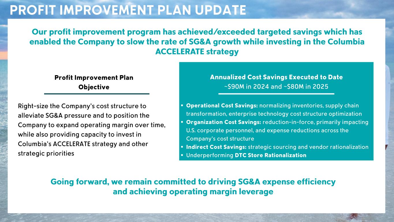 CSC Confidential – Sensitive Information PROFIT IMPROVEMENT PLAN UPDATE Our profit improvement program has achieved/exceeded targeted savings which has enabled the Company to slow the rate of SG&A growt h while investing in the Columbia ACCELERATE strategy Annualized Cost Savings Executed to Date ~$90M in 2024 and ~$80M in 2025 ▪ Operational Cost Savings: normalizing inventories, supply chain transformation, enterprise technology cost structure optimization ▪ Organization Cost Savings: reduction - in- force, primarily impacting U.S. corporate personnel, and expense reductions across the Company’s cost structure ▪ Indirect Cost Savings: strategic sourcing and vendor rationalization ▪ Underperforming DTC Store Rationalization Profit Improvement Plan Objective Right - size the Company’s cost structure to alleviate SG&A pressure and to position the Company to expand operating margin over time, while also providing capacity to invest in Columbia’s ACCELERATE strategy and other strategic priorities Going forward, we remain committed to driving SG&A expense efficiency and achieving operating margin leverage