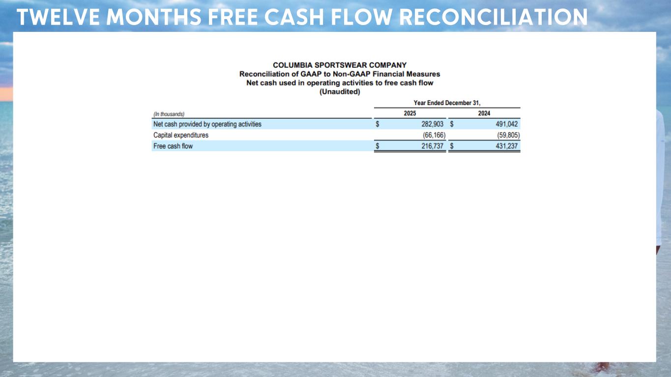 Since Columbia Sportswear Company is a global company, the comparability of its operating results reported in U.S. dollars is affected by foreign currency exchange rate fluctuations because the underlying currencies in which it transacts change in value over time compared to the U.S. dollar . To supplement financial information reported in accordance with GAAP, the Company discloses constant - currency net sales information, which is a non - GAAP financial measure, to provide a framework to assess how the business performed excluding the effects of changes in the exchange rates used to translate net sales generated in foreign currencies into U.S. dollars . The Company calculates constant - currency net sales by translating net sales in foreign currencies for the current period into U.S. dollars at the average exchange rates that were in effect during the comparable period of the prior year . Management believes that this non - GAAP financial measure reflects an additional and useful way of viewing an aspect of our operations that, when viewed in conjunction with our GAAP results, provides a more comprehensive understanding of our business and operations . Free cash flow is a non - GAAP financial measure . Free cash flow is calculated by reducing net cash flow from operating activities by capital expenditures . Management believes free cash flow provides investors with an important perspective on the cash available for shareholders and acquisitions after making the capital investments required to support ongoing business operations and long - term value creation . Free cash flow does not represent the residual cash flow available for discretionary expenditures as it excludes certain mandatory expenditures . Management uses free cash flow as a measure to assess both business performance and overall liquidity . Non - GAAP financial measures, including constant - currency net sales and free cash flow, should be viewed in addition to, and not in lieu of or superior to, our financial measures calculated in accordance with GAAP . The Company provides a reconciliation of non - GAAP measures to the most directly comparable financial measure calculated in accordance with GAAP in the back of this presentation in the “Appendix” . The non - GAAP financial measures and constant - currency information presented may not be comparable to similarly titled measures reported by other companies . REFERENCES TO NON - GAAP FINANCIAL INFORMATION GLOSSARY OF PRESENTATION TERMINOLOGY DTC DTC.com DTC B&M y/y U.S. LAAP EMEA SG&A EPS bps direct-to-consumer DTC e-commerce DTC brick & mortar year-over-year United States Latin America and Asia Pacific Europe, Middle East and Africa selling, general & administrative earnings per share basis points “+” or “up” “-” or “down” LSD% MSD% HSD% LDD% low-20% mid-30% high-40% increased decreased low-single-digit percent mid-single-digit percent high-single-digit percent low-double-digit percent low-twenties percent mid-thirties percent high-forties percent “$##M” “$##B” c.c. M&A FX ~ H# Q# YTD in millions of U.S. dollars in billions of U.S. dollars constant-currency mergers & acquisitions foreign currency exchange approximately First half, second half Quarter 1, 2, 3, 4 Year-to-date