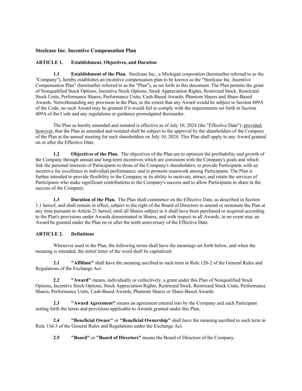 Steelcase Inc. Incentive Compensation Plan ARTICLE 1. Establishment, Objectives, and Duration 1.1 Establishment of the Plan. Steelcase Inc., a Michigan corporation (hereinafter referred to as the "Company"), hereby establishes an incentive compensation plan to be known as the "Steelcase Inc. Incentive Compensation Plan" (hereinafter referred to as the "Plan"), as set forth in this document. The Plan permits the grant of Nonqualified Stock Options, Incentive Stock Options, Stock Appreciation Rights, Restricted Stock, Restricted Stock Units, Performance Shares, Performance Units, Cash-Based Awards, Phantom Shares and Share-Based Awards. Notwithstanding any provision in the Plan, to the extent that any Award would be subject to Section 409A of the Code, no such Award may be granted if it would fail to comply with the requirements set forth in Section 409A of the Code and any regulations or guidance promulgated thereunder. The Plan as hereby amended and restated is effective as of July 10, 2024 (the "Effective Date"); provided, however, that the Plan as amended and restated shall be subject to the approval by the shareholders of the Company of the Plan at the annual meeting for such shareholders on July 10, 2024. This Plan shall apply to any Award granted on or after the Effective Date. 1.2 Objectives of the Plan. The objectives of the Plan are to optimize the profitability and growth of the Company through annual and long-term incentives which are consistent with the Company's goals and which link the personal interests of Participants to those of the Company's shareholders; to provide Participants with an incentive for excellence in individual performance; and to promote teamwork among Participants. The Plan is further intended to provide flexibility to the Company in its ability to motivate, attract, and retain the services of Participants who make significant contributions to the Company's success and to allow Participants to share in the success of the Company. 1.3 Duration of the Plan. The Plan shall commence on the Effective Date, as described in Section 1.1 hereof, and shall remain in effect, subject to the right of the Board of Directors to amend or terminate the Plan at any time pursuant to Article 21 hereof, until all Shares subject to it shall have been purchased or acquired according to the Plan's provisions under Awards denominated in Shares, and with respect to all Awards, in no event may an Award be granted under the Plan on or after the tenth anniversary of the Effective Date. ARTICLE 2. Definitions Whenever used in the Plan, the following terms shall have the meanings set forth below, and when the meaning is intended, the initial letter of the word shall be capitalized: 2.1 "Affiliate" shall have the meaning ascribed to such term in Rule 12b-2 of the General Rules and Regulations of the Exchange Act. 2.2 "Award" means, individually or collectively, a grant under this Plan of Nonqualified Stock Options, Incentive Stock Options, Stock Appreciation Rights, Restricted Stock, Restricted Stock Units, Performance Shares, Performance Units, Cash-Based Awards, Phantom Shares or Share-Based Awards. 2.3 "Award Agreement" means an agreement entered into by the Company and each Participant setting forth the terms and provisions applicable to Awards granted under this Plan. 2.4 "Beneficial Owner" or "Beneficial Ownership" shall have the meaning ascribed to such term in Rule 13d-3 of the General Rules and Regulations under the Exchange Act. 2.5 "Board" or "Board of Directors" means the Board of Directors of the Company.