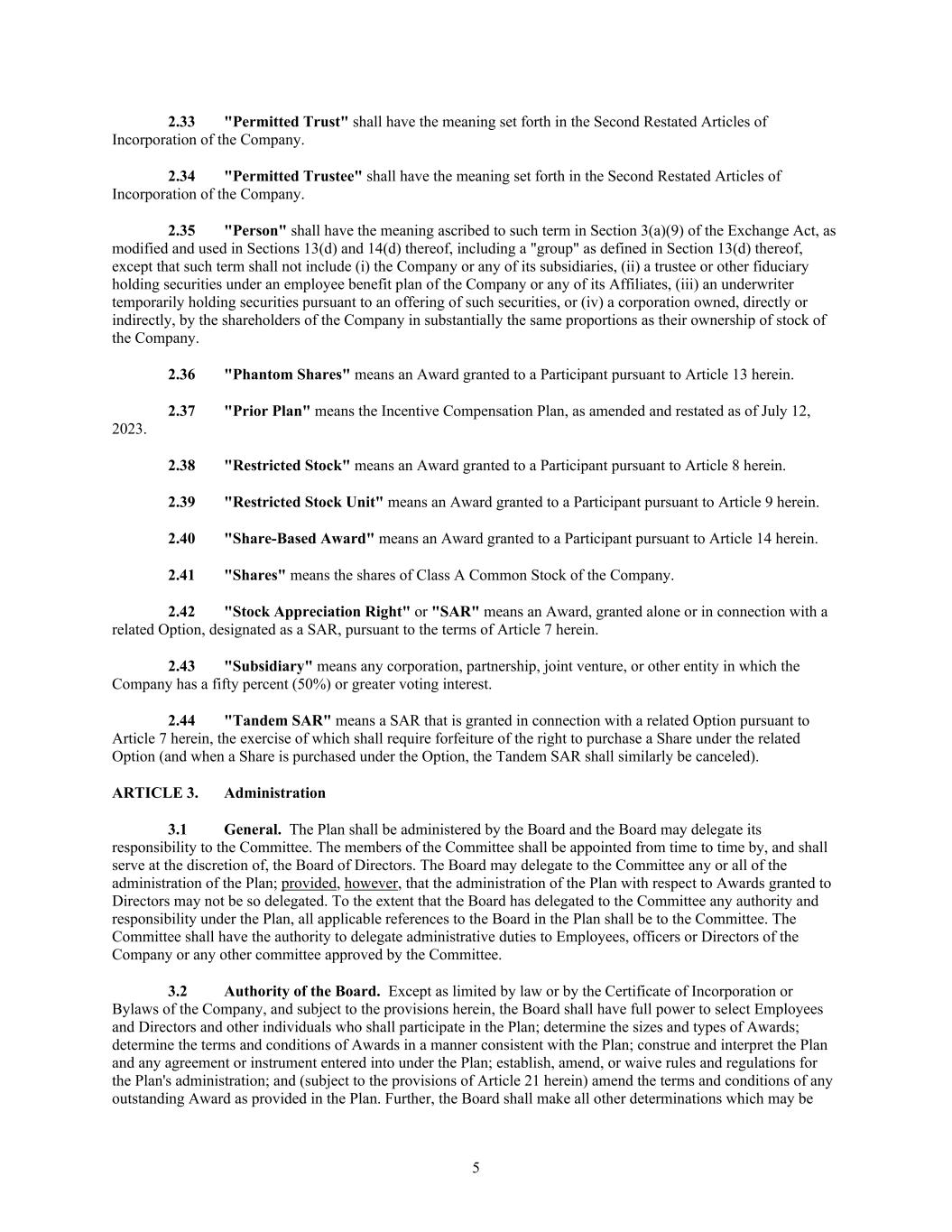 5 2.33 "Permitted Trust" shall have the meaning set forth in the Second Restated Articles of Incorporation of the Company. 2.34 "Permitted Trustee" shall have the meaning set forth in the Second Restated Articles of Incorporation of the Company. 2.35 "Person" shall have the meaning ascribed to such term in Section 3(a)(9) of the Exchange Act, as modified and used in Sections 13(d) and 14(d) thereof, including a "group" as defined in Section 13(d) thereof, except that such term shall not include (i) the Company or any of its subsidiaries, (ii) a trustee or other fiduciary holding securities under an employee benefit plan of the Company or any of its Affiliates, (iii) an underwriter temporarily holding securities pursuant to an offering of such securities, or (iv) a corporation owned, directly or indirectly, by the shareholders of the Company in substantially the same proportions as their ownership of stock of the Company. 2.36 "Phantom Shares" means an Award granted to a Participant pursuant to Article 13 herein. 2.37 "Prior Plan" means the Incentive Compensation Plan, as amended and restated as of July 12, 2023. 2.38 "Restricted Stock" means an Award granted to a Participant pursuant to Article 8 herein. 2.39 "Restricted Stock Unit" means an Award granted to a Participant pursuant to Article 9 herein. 2.40 "Share-Based Award" means an Award granted to a Participant pursuant to Article 14 herein. 2.41 "Shares" means the shares of Class A Common Stock of the Company. 2.42 "Stock Appreciation Right" or "SAR" means an Award, granted alone or in connection with a related Option, designated as a SAR, pursuant to the terms of Article 7 herein. 2.43 "Subsidiary" means any corporation, partnership, joint venture, or other entity in which the Company has a fifty percent (50%) or greater voting interest. 2.44 "Tandem SAR" means a SAR that is granted in connection with a related Option pursuant to Article 7 herein, the exercise of which shall require forfeiture of the right to purchase a Share under the related Option (and when a Share is purchased under the Option, the Tandem SAR shall similarly be canceled). ARTICLE 3. Administration 3.1 General. The Plan shall be administered by the Board and the Board may delegate its responsibility to the Committee. The members of the Committee shall be appointed from time to time by, and shall serve at the discretion of, the Board of Directors. The Board may delegate to the Committee any or all of the administration of the Plan; provided, however, that the administration of the Plan with respect to Awards granted to Directors may not be so delegated. To the extent that the Board has delegated to the Committee any authority and responsibility under the Plan, all applicable references to the Board in the Plan shall be to the Committee. The Committee shall have the authority to delegate administrative duties to Employees, officers or Directors of the Company or any other committee approved by the Committee. 3.2 Authority of the Board. Except as limited by law or by the Certificate of Incorporation or Bylaws of the Company, and subject to the provisions herein, the Board shall have full power to select Employees and Directors and other individuals who shall participate in the Plan; determine the sizes and types of Awards; determine the terms and conditions of Awards in a manner consistent with the Plan; construe and interpret the Plan and any agreement or instrument entered into under the Plan; establish, amend, or waive rules and regulations for the Plan's administration; and (subject to the provisions of Article 21 herein) amend the terms and conditions of any outstanding Award as provided in the Plan. Further, the Board shall make all other determinations which may be