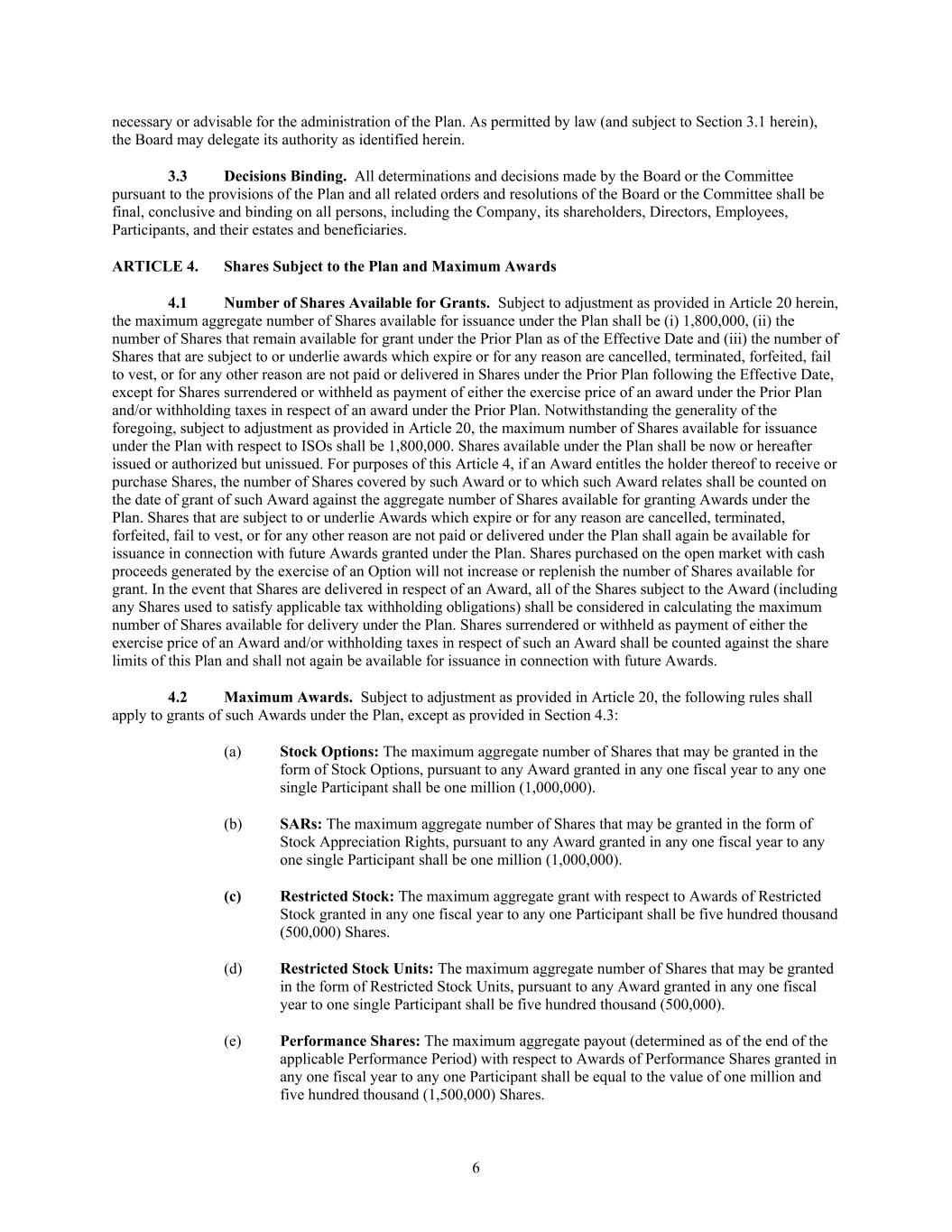 6 necessary or advisable for the administration of the Plan. As permitted by law (and subject to Section 3.1 herein), the Board may delegate its authority as identified herein. 3.3 Decisions Binding. All determinations and decisions made by the Board or the Committee pursuant to the provisions of the Plan and all related orders and resolutions of the Board or the Committee shall be final, conclusive and binding on all persons, including the Company, its shareholders, Directors, Employees, Participants, and their estates and beneficiaries. ARTICLE 4. Shares Subject to the Plan and Maximum Awards 4.1 Number of Shares Available for Grants. Subject to adjustment as provided in Article 20 herein, the maximum aggregate number of Shares available for issuance under the Plan shall be (i) 1,800,000, (ii) the number of Shares that remain available for grant under the Prior Plan as of the Effective Date and (iii) the number of Shares that are subject to or underlie awards which expire or for any reason are cancelled, terminated, forfeited, fail to vest, or for any other reason are not paid or delivered in Shares under the Prior Plan following the Effective Date, except for Shares surrendered or withheld as payment of either the exercise price of an award under the Prior Plan and/or withholding taxes in respect of an award under the Prior Plan. Notwithstanding the generality of the foregoing, subject to adjustment as provided in Article 20, the maximum number of Shares available for issuance under the Plan with respect to ISOs shall be 1,800,000. Shares available under the Plan shall be now or hereafter issued or authorized but unissued. For purposes of this Article 4, if an Award entitles the holder thereof to receive or purchase Shares, the number of Shares covered by such Award or to which such Award relates shall be counted on the date of grant of such Award against the aggregate number of Shares available for granting Awards under the Plan. Shares that are subject to or underlie Awards which expire or for any reason are cancelled, terminated, forfeited, fail to vest, or for any other reason are not paid or delivered under the Plan shall again be available for issuance in connection with future Awards granted under the Plan. Shares purchased on the open market with cash proceeds generated by the exercise of an Option will not increase or replenish the number of Shares available for grant. In the event that Shares are delivered in respect of an Award, all of the Shares subject to the Award (including any Shares used to satisfy applicable tax withholding obligations) shall be considered in calculating the maximum number of Shares available for delivery under the Plan. Shares surrendered or withheld as payment of either the exercise price of an Award and/or withholding taxes in respect of such an Award shall be counted against the share limits of this Plan and shall not again be available for issuance in connection with future Awards. 4.2 Maximum Awards. Subject to adjustment as provided in Article 20, the following rules shall apply to grants of such Awards under the Plan, except as provided in Section 4.3: (a) Stock Options: The maximum aggregate number of Shares that may be granted in the form of Stock Options, pursuant to any Award granted in any one fiscal year to any one single Participant shall be one million (1,000,000). (b) SARs: The maximum aggregate number of Shares that may be granted in the form of Stock Appreciation Rights, pursuant to any Award granted in any one fiscal year to any one single Participant shall be one million (1,000,000). (c) Restricted Stock: The maximum aggregate grant with respect to Awards of Restricted Stock granted in any one fiscal year to any one Participant shall be five hundred thousand (500,000) Shares. (d) Restricted Stock Units: The maximum aggregate number of Shares that may be granted in the form of Restricted Stock Units, pursuant to any Award granted in any one fiscal year to one single Participant shall be five hundred thousand (500,000). (e) Performance Shares: The maximum aggregate payout (determined as of the end of the applicable Performance Period) with respect to Awards of Performance Shares granted in any one fiscal year to any one Participant shall be equal to the value of one million and five hundred thousand (1,500,000) Shares.