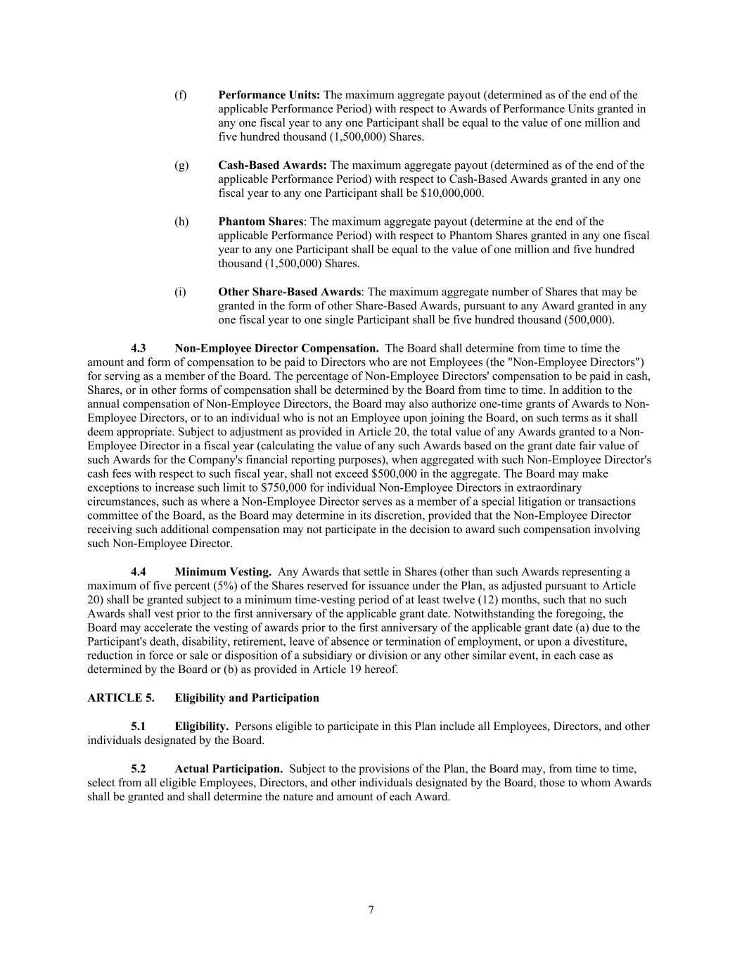 7 (f) Performance Units: The maximum aggregate payout (determined as of the end of the applicable Performance Period) with respect to Awards of Performance Units granted in any one fiscal year to any one Participant shall be equal to the value of one million and five hundred thousand (1,500,000) Shares. (g) Cash-Based Awards: The maximum aggregate payout (determined as of the end of the applicable Performance Period) with respect to Cash-Based Awards granted in any one fiscal year to any one Participant shall be $10,000,000. (h) Phantom Shares: The maximum aggregate payout (determine at the end of the applicable Performance Period) with respect to Phantom Shares granted in any one fiscal year to any one Participant shall be equal to the value of one million and five hundred thousand (1,500,000) Shares. (i) Other Share-Based Awards: The maximum aggregate number of Shares that may be granted in the form of other Share-Based Awards, pursuant to any Award granted in any one fiscal year to one single Participant shall be five hundred thousand (500,000). 4.3 Non-Employee Director Compensation. The Board shall determine from time to time the amount and form of compensation to be paid to Directors who are not Employees (the "Non-Employee Directors") for serving as a member of the Board. The percentage of Non-Employee Directors' compensation to be paid in cash, Shares, or in other forms of compensation shall be determined by the Board from time to time. In addition to the annual compensation of Non-Employee Directors, the Board may also authorize one-time grants of Awards to Non- Employee Directors, or to an individual who is not an Employee upon joining the Board, on such terms as it shall deem appropriate. Subject to adjustment as provided in Article 20, the total value of any Awards granted to a Non- Employee Director in a fiscal year (calculating the value of any such Awards based on the grant date fair value of such Awards for the Company's financial reporting purposes), when aggregated with such Non-Employee Director's cash fees with respect to such fiscal year, shall not exceed $500,000 in the aggregate. The Board may make exceptions to increase such limit to $750,000 for individual Non-Employee Directors in extraordinary circumstances, such as where a Non-Employee Director serves as a member of a special litigation or transactions committee of the Board, as the Board may determine in its discretion, provided that the Non-Employee Director receiving such additional compensation may not participate in the decision to award such compensation involving such Non-Employee Director. 4.4 Minimum Vesting. Any Awards that settle in Shares (other than such Awards representing a maximum of five percent (5%) of the Shares reserved for issuance under the Plan, as adjusted pursuant to Article 20) shall be granted subject to a minimum time-vesting period of at least twelve (12) months, such that no such Awards shall vest prior to the first anniversary of the applicable grant date. Notwithstanding the foregoing, the Board may accelerate the vesting of awards prior to the first anniversary of the applicable grant date (a) due to the Participant's death, disability, retirement, leave of absence or termination of employment, or upon a divestiture, reduction in force or sale or disposition of a subsidiary or division or any other similar event, in each case as determined by the Board or (b) as provided in Article 19 hereof. ARTICLE 5. Eligibility and Participation 5.1 Eligibility. Persons eligible to participate in this Plan include all Employees, Directors, and other individuals designated by the Board. 5.2 Actual Participation. Subject to the provisions of the Plan, the Board may, from time to time, select from all eligible Employees, Directors, and other individuals designated by the Board, those to whom Awards shall be granted and shall determine the nature and amount of each Award.