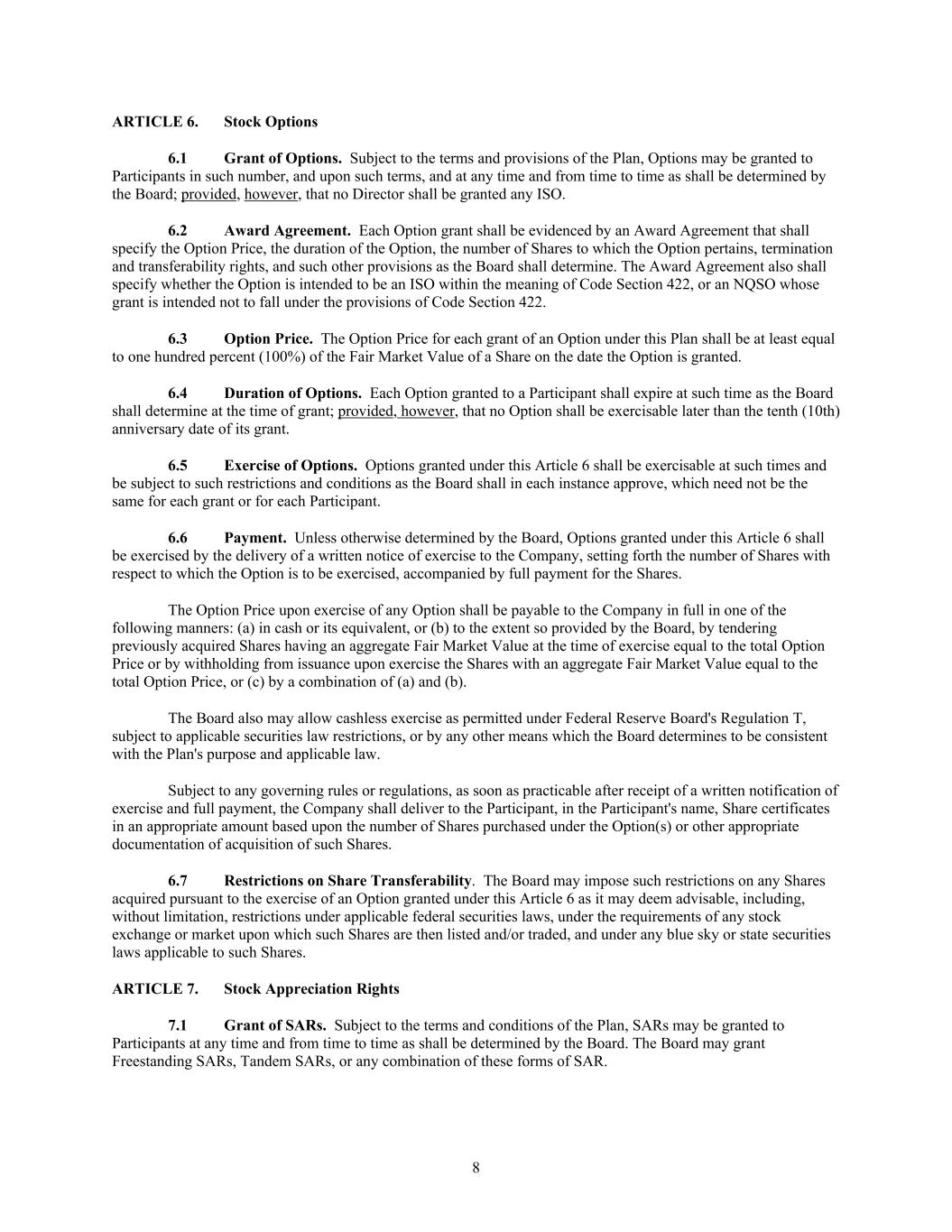 8 ARTICLE 6. Stock Options 6.1 Grant of Options. Subject to the terms and provisions of the Plan, Options may be granted to Participants in such number, and upon such terms, and at any time and from time to time as shall be determined by the Board; provided, however, that no Director shall be granted any ISO. 6.2 Award Agreement. Each Option grant shall be evidenced by an Award Agreement that shall specify the Option Price, the duration of the Option, the number of Shares to which the Option pertains, termination and transferability rights, and such other provisions as the Board shall determine. The Award Agreement also shall specify whether the Option is intended to be an ISO within the meaning of Code Section 422, or an NQSO whose grant is intended not to fall under the provisions of Code Section 422. 6.3 Option Price. The Option Price for each grant of an Option under this Plan shall be at least equal to one hundred percent (100%) of the Fair Market Value of a Share on the date the Option is granted. 6.4 Duration of Options. Each Option granted to a Participant shall expire at such time as the Board shall determine at the time of grant; provided, however, that no Option shall be exercisable later than the tenth (10th) anniversary date of its grant. 6.5 Exercise of Options. Options granted under this Article 6 shall be exercisable at such times and be subject to such restrictions and conditions as the Board shall in each instance approve, which need not be the same for each grant or for each Participant. 6.6 Payment. Unless otherwise determined by the Board, Options granted under this Article 6 shall be exercised by the delivery of a written notice of exercise to the Company, setting forth the number of Shares with respect to which the Option is to be exercised, accompanied by full payment for the Shares. The Option Price upon exercise of any Option shall be payable to the Company in full in one of the following manners: (a) in cash or its equivalent, or (b) to the extent so provided by the Board, by tendering previously acquired Shares having an aggregate Fair Market Value at the time of exercise equal to the total Option Price or by withholding from issuance upon exercise the Shares with an aggregate Fair Market Value equal to the total Option Price, or (c) by a combination of (a) and (b). The Board also may allow cashless exercise as permitted under Federal Reserve Board's Regulation T, subject to applicable securities law restrictions, or by any other means which the Board determines to be consistent with the Plan's purpose and applicable law. Subject to any governing rules or regulations, as soon as practicable after receipt of a written notification of exercise and full payment, the Company shall deliver to the Participant, in the Participant's name, Share certificates in an appropriate amount based upon the number of Shares purchased under the Option(s) or other appropriate documentation of acquisition of such Shares. 6.7 Restrictions on Share Transferability. The Board may impose such restrictions on any Shares acquired pursuant to the exercise of an Option granted under this Article 6 as it may deem advisable, including, without limitation, restrictions under applicable federal securities laws, under the requirements of any stock exchange or market upon which such Shares are then listed and/or traded, and under any blue sky or state securities laws applicable to such Shares. ARTICLE 7. Stock Appreciation Rights 7.1 Grant of SARs. Subject to the terms and conditions of the Plan, SARs may be granted to Participants at any time and from time to time as shall be determined by the Board. The Board may grant Freestanding SARs, Tandem SARs, or any combination of these forms of SAR.