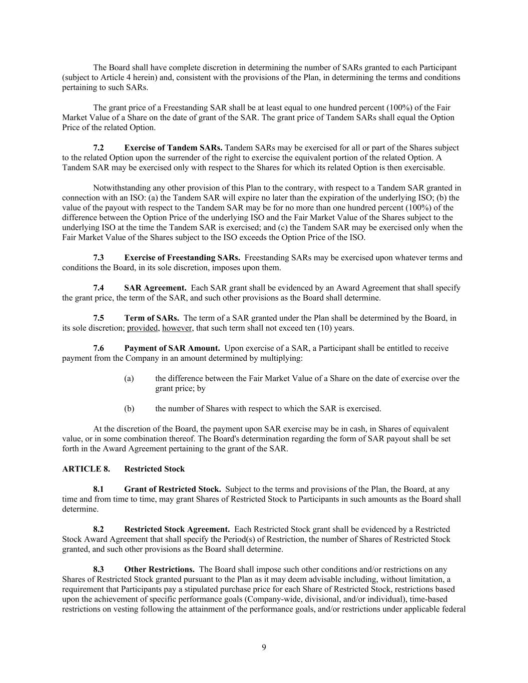9 The Board shall have complete discretion in determining the number of SARs granted to each Participant (subject to Article 4 herein) and, consistent with the provisions of the Plan, in determining the terms and conditions pertaining to such SARs. The grant price of a Freestanding SAR shall be at least equal to one hundred percent (100%) of the Fair Market Value of a Share on the date of grant of the SAR. The grant price of Tandem SARs shall equal the Option Price of the related Option. 7.2 Exercise of Tandem SARs. Tandem SARs may be exercised for all or part of the Shares subject to the related Option upon the surrender of the right to exercise the equivalent portion of the related Option. A Tandem SAR may be exercised only with respect to the Shares for which its related Option is then exercisable. Notwithstanding any other provision of this Plan to the contrary, with respect to a Tandem SAR granted in connection with an ISO: (a) the Tandem SAR will expire no later than the expiration of the underlying ISO; (b) the value of the payout with respect to the Tandem SAR may be for no more than one hundred percent (100%) of the difference between the Option Price of the underlying ISO and the Fair Market Value of the Shares subject to the underlying ISO at the time the Tandem SAR is exercised; and (c) the Tandem SAR may be exercised only when the Fair Market Value of the Shares subject to the ISO exceeds the Option Price of the ISO. 7.3 Exercise of Freestanding SARs. Freestanding SARs may be exercised upon whatever terms and conditions the Board, in its sole discretion, imposes upon them. 7.4 SAR Agreement. Each SAR grant shall be evidenced by an Award Agreement that shall specify the grant price, the term of the SAR, and such other provisions as the Board shall determine. 7.5 Term of SARs. The term of a SAR granted under the Plan shall be determined by the Board, in its sole discretion; provided, however, that such term shall not exceed ten (10) years. 7.6 Payment of SAR Amount. Upon exercise of a SAR, a Participant shall be entitled to receive payment from the Company in an amount determined by multiplying: (a) the difference between the Fair Market Value of a Share on the date of exercise over the grant price; by (b) the number of Shares with respect to which the SAR is exercised. At the discretion of the Board, the payment upon SAR exercise may be in cash, in Shares of equivalent value, or in some combination thereof. The Board's determination regarding the form of SAR payout shall be set forth in the Award Agreement pertaining to the grant of the SAR. ARTICLE 8. Restricted Stock 8.1 Grant of Restricted Stock. Subject to the terms and provisions of the Plan, the Board, at any time and from time to time, may grant Shares of Restricted Stock to Participants in such amounts as the Board shall determine. 8.2 Restricted Stock Agreement. Each Restricted Stock grant shall be evidenced by a Restricted Stock Award Agreement that shall specify the Period(s) of Restriction, the number of Shares of Restricted Stock granted, and such other provisions as the Board shall determine. 8.3 Other Restrictions. The Board shall impose such other conditions and/or restrictions on any Shares of Restricted Stock granted pursuant to the Plan as it may deem advisable including, without limitation, a requirement that Participants pay a stipulated purchase price for each Share of Restricted Stock, restrictions based upon the achievement of specific performance goals (Company-wide, divisional, and/or individual), time-based restrictions on vesting following the attainment of the performance goals, and/or restrictions under applicable federal