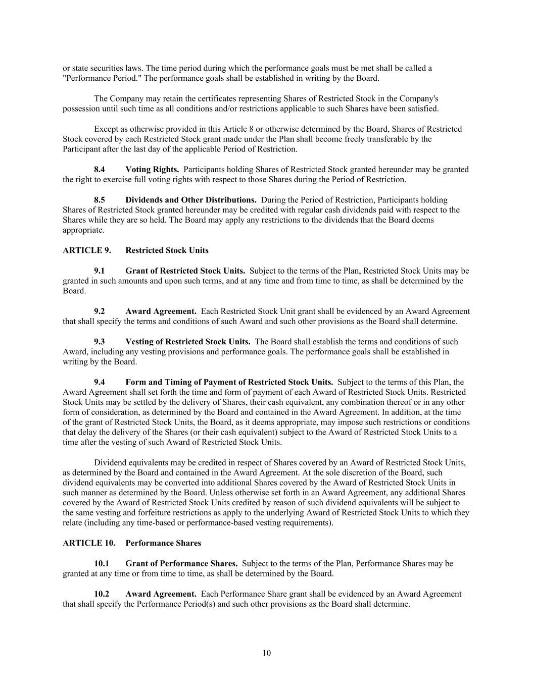10 or state securities laws. The time period during which the performance goals must be met shall be called a "Performance Period." The performance goals shall be established in writing by the Board. The Company may retain the certificates representing Shares of Restricted Stock in the Company's possession until such time as all conditions and/or restrictions applicable to such Shares have been satisfied. Except as otherwise provided in this Article 8 or otherwise determined by the Board, Shares of Restricted Stock covered by each Restricted Stock grant made under the Plan shall become freely transferable by the Participant after the last day of the applicable Period of Restriction. 8.4 Voting Rights. Participants holding Shares of Restricted Stock granted hereunder may be granted the right to exercise full voting rights with respect to those Shares during the Period of Restriction. 8.5 Dividends and Other Distributions. During the Period of Restriction, Participants holding Shares of Restricted Stock granted hereunder may be credited with regular cash dividends paid with respect to the Shares while they are so held. The Board may apply any restrictions to the dividends that the Board deems appropriate. ARTICLE 9. Restricted Stock Units 9.1 Grant of Restricted Stock Units. Subject to the terms of the Plan, Restricted Stock Units may be granted in such amounts and upon such terms, and at any time and from time to time, as shall be determined by the Board. 9.2 Award Agreement. Each Restricted Stock Unit grant shall be evidenced by an Award Agreement that shall specify the terms and conditions of such Award and such other provisions as the Board shall determine. 9.3 Vesting of Restricted Stock Units. The Board shall establish the terms and conditions of such Award, including any vesting provisions and performance goals. The performance goals shall be established in writing by the Board. 9.4 Form and Timing of Payment of Restricted Stock Units. Subject to the terms of this Plan, the Award Agreement shall set forth the time and form of payment of each Award of Restricted Stock Units. Restricted Stock Units may be settled by the delivery of Shares, their cash equivalent, any combination thereof or in any other form of consideration, as determined by the Board and contained in the Award Agreement. In addition, at the time of the grant of Restricted Stock Units, the Board, as it deems appropriate, may impose such restrictions or conditions that delay the delivery of the Shares (or their cash equivalent) subject to the Award of Restricted Stock Units to a time after the vesting of such Award of Restricted Stock Units. Dividend equivalents may be credited in respect of Shares covered by an Award of Restricted Stock Units, as determined by the Board and contained in the Award Agreement. At the sole discretion of the Board, such dividend equivalents may be converted into additional Shares covered by the Award of Restricted Stock Units in such manner as determined by the Board. Unless otherwise set forth in an Award Agreement, any additional Shares covered by the Award of Restricted Stock Units credited by reason of such dividend equivalents will be subject to the same vesting and forfeiture restrictions as apply to the underlying Award of Restricted Stock Units to which they relate (including any time-based or performance-based vesting requirements). ARTICLE 10. Performance Shares 10.1 Grant of Performance Shares. Subject to the terms of the Plan, Performance Shares may be granted at any time or from time to time, as shall be determined by the Board. 10.2 Award Agreement. Each Performance Share grant shall be evidenced by an Award Agreement that shall specify the Performance Period(s) and such other provisions as the Board shall determine.