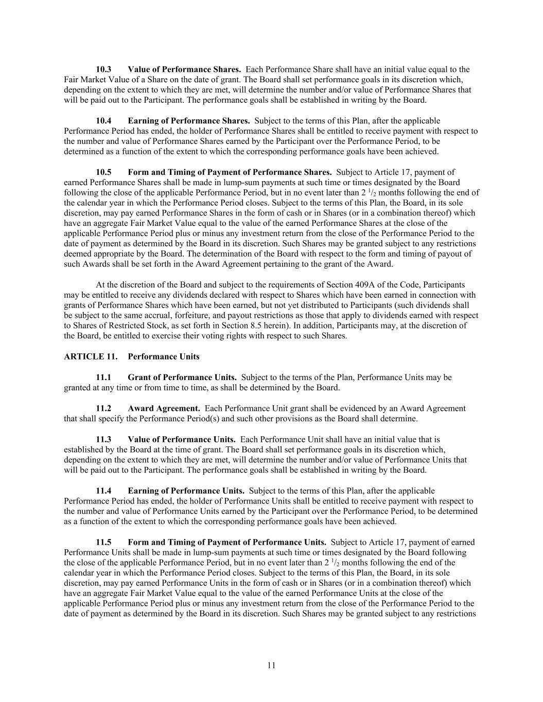 11 10.3 Value of Performance Shares. Each Performance Share shall have an initial value equal to the Fair Market Value of a Share on the date of grant. The Board shall set performance goals in its discretion which, depending on the extent to which they are met, will determine the number and/or value of Performance Shares that will be paid out to the Participant. The performance goals shall be established in writing by the Board. 10.4 Earning of Performance Shares. Subject to the terms of this Plan, after the applicable Performance Period has ended, the holder of Performance Shares shall be entitled to receive payment with respect to the number and value of Performance Shares earned by the Participant over the Performance Period, to be determined as a function of the extent to which the corresponding performance goals have been achieved. 10.5 Form and Timing of Payment of Performance Shares. Subject to Article 17, payment of earned Performance Shares shall be made in lump-sum payments at such time or times designated by the Board following the close of the applicable Performance Period, but in no event later than 2 1/2 months following the end of the calendar year in which the Performance Period closes. Subject to the terms of this Plan, the Board, in its sole discretion, may pay earned Performance Shares in the form of cash or in Shares (or in a combination thereof) which have an aggregate Fair Market Value equal to the value of the earned Performance Shares at the close of the applicable Performance Period plus or minus any investment return from the close of the Performance Period to the date of payment as determined by the Board in its discretion. Such Shares may be granted subject to any restrictions deemed appropriate by the Board. The determination of the Board with respect to the form and timing of payout of such Awards shall be set forth in the Award Agreement pertaining to the grant of the Award. At the discretion of the Board and subject to the requirements of Section 409A of the Code, Participants may be entitled to receive any dividends declared with respect to Shares which have been earned in connection with grants of Performance Shares which have been earned, but not yet distributed to Participants (such dividends shall be subject to the same accrual, forfeiture, and payout restrictions as those that apply to dividends earned with respect to Shares of Restricted Stock, as set forth in Section 8.5 herein). In addition, Participants may, at the discretion of the Board, be entitled to exercise their voting rights with respect to such Shares. ARTICLE 11. Performance Units 11.1 Grant of Performance Units. Subject to the terms of the Plan, Performance Units may be granted at any time or from time to time, as shall be determined by the Board. 11.2 Award Agreement. Each Performance Unit grant shall be evidenced by an Award Agreement that shall specify the Performance Period(s) and such other provisions as the Board shall determine. 11.3 Value of Performance Units. Each Performance Unit shall have an initial value that is established by the Board at the time of grant. The Board shall set performance goals in its discretion which, depending on the extent to which they are met, will determine the number and/or value of Performance Units that will be paid out to the Participant. The performance goals shall be established in writing by the Board. 11.4 Earning of Performance Units. Subject to the terms of this Plan, after the applicable Performance Period has ended, the holder of Performance Units shall be entitled to receive payment with respect to the number and value of Performance Units earned by the Participant over the Performance Period, to be determined as a function of the extent to which the corresponding performance goals have been achieved. 11.5 Form and Timing of Payment of Performance Units. Subject to Article 17, payment of earned Performance Units shall be made in lump-sum payments at such time or times designated by the Board following the close of the applicable Performance Period, but in no event later than 2 1/2 months following the end of the calendar year in which the Performance Period closes. Subject to the terms of this Plan, the Board, in its sole discretion, may pay earned Performance Units in the form of cash or in Shares (or in a combination thereof) which have an aggregate Fair Market Value equal to the value of the earned Performance Units at the close of the applicable Performance Period plus or minus any investment return from the close of the Performance Period to the date of payment as determined by the Board in its discretion. Such Shares may be granted subject to any restrictions