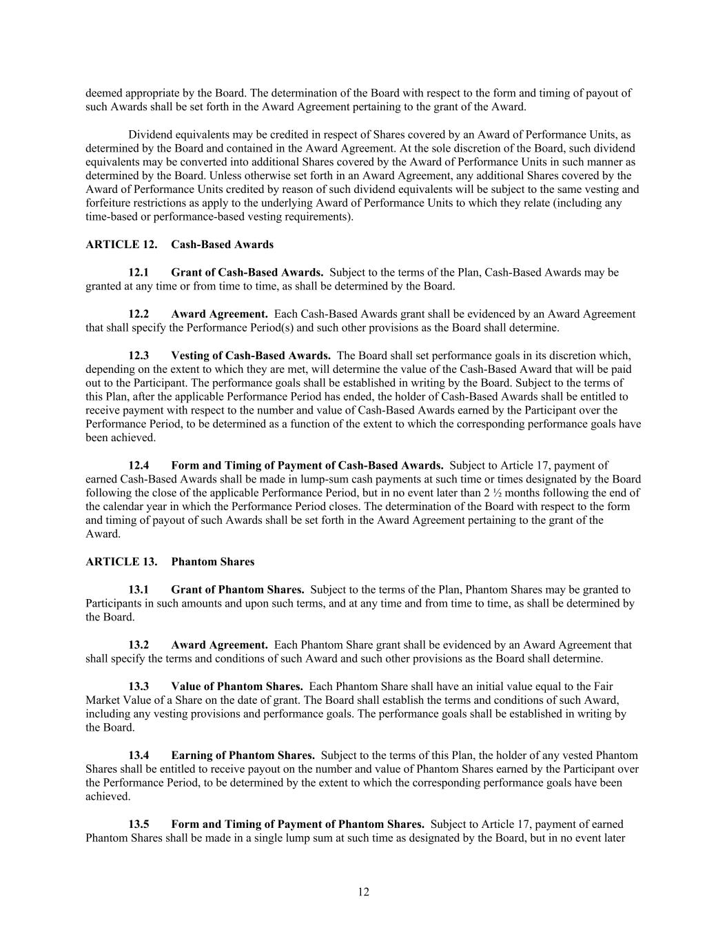 12 deemed appropriate by the Board. The determination of the Board with respect to the form and timing of payout of such Awards shall be set forth in the Award Agreement pertaining to the grant of the Award. Dividend equivalents may be credited in respect of Shares covered by an Award of Performance Units, as determined by the Board and contained in the Award Agreement. At the sole discretion of the Board, such dividend equivalents may be converted into additional Shares covered by the Award of Performance Units in such manner as determined by the Board. Unless otherwise set forth in an Award Agreement, any additional Shares covered by the Award of Performance Units credited by reason of such dividend equivalents will be subject to the same vesting and forfeiture restrictions as apply to the underlying Award of Performance Units to which they relate (including any time-based or performance-based vesting requirements). ARTICLE 12. Cash-Based Awards 12.1 Grant of Cash-Based Awards. Subject to the terms of the Plan, Cash-Based Awards may be granted at any time or from time to time, as shall be determined by the Board. 12.2 Award Agreement. Each Cash-Based Awards grant shall be evidenced by an Award Agreement that shall specify the Performance Period(s) and such other provisions as the Board shall determine. 12.3 Vesting of Cash-Based Awards. The Board shall set performance goals in its discretion which, depending on the extent to which they are met, will determine the value of the Cash-Based Award that will be paid out to the Participant. The performance goals shall be established in writing by the Board. Subject to the terms of this Plan, after the applicable Performance Period has ended, the holder of Cash-Based Awards shall be entitled to receive payment with respect to the number and value of Cash-Based Awards earned by the Participant over the Performance Period, to be determined as a function of the extent to which the corresponding performance goals have been achieved. 12.4 Form and Timing of Payment of Cash-Based Awards. Subject to Article 17, payment of earned Cash-Based Awards shall be made in lump-sum cash payments at such time or times designated by the Board following the close of the applicable Performance Period, but in no event later than 2 ½ months following the end of the calendar year in which the Performance Period closes. The determination of the Board with respect to the form and timing of payout of such Awards shall be set forth in the Award Agreement pertaining to the grant of the Award. ARTICLE 13. Phantom Shares 13.1 Grant of Phantom Shares. Subject to the terms of the Plan, Phantom Shares may be granted to Participants in such amounts and upon such terms, and at any time and from time to time, as shall be determined by the Board. 13.2 Award Agreement. Each Phantom Share grant shall be evidenced by an Award Agreement that shall specify the terms and conditions of such Award and such other provisions as the Board shall determine. 13.3 Value of Phantom Shares. Each Phantom Share shall have an initial value equal to the Fair Market Value of a Share on the date of grant. The Board shall establish the terms and conditions of such Award, including any vesting provisions and performance goals. The performance goals shall be established in writing by the Board. 13.4 Earning of Phantom Shares. Subject to the terms of this Plan, the holder of any vested Phantom Shares shall be entitled to receive payout on the number and value of Phantom Shares earned by the Participant over the Performance Period, to be determined by the extent to which the corresponding performance goals have been achieved. 13.5 Form and Timing of Payment of Phantom Shares. Subject to Article 17, payment of earned Phantom Shares shall be made in a single lump sum at such time as designated by the Board, but in no event later
