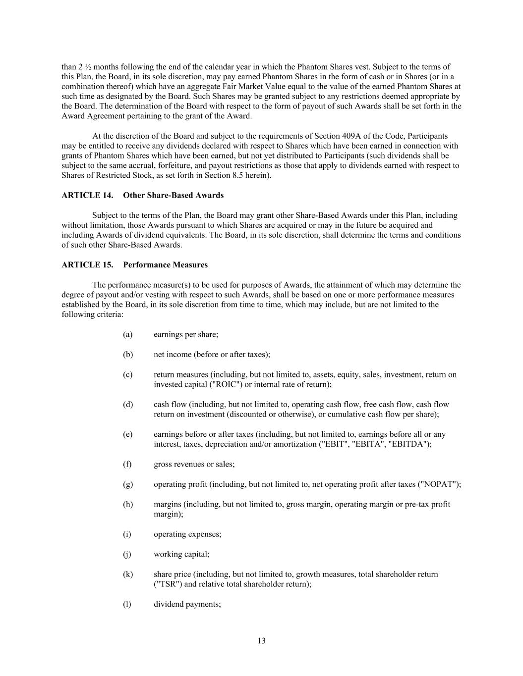 13 than 2 ½ months following the end of the calendar year in which the Phantom Shares vest. Subject to the terms of this Plan, the Board, in its sole discretion, may pay earned Phantom Shares in the form of cash or in Shares (or in a combination thereof) which have an aggregate Fair Market Value equal to the value of the earned Phantom Shares at such time as designated by the Board. Such Shares may be granted subject to any restrictions deemed appropriate by the Board. The determination of the Board with respect to the form of payout of such Awards shall be set forth in the Award Agreement pertaining to the grant of the Award. At the discretion of the Board and subject to the requirements of Section 409A of the Code, Participants may be entitled to receive any dividends declared with respect to Shares which have been earned in connection with grants of Phantom Shares which have been earned, but not yet distributed to Participants (such dividends shall be subject to the same accrual, forfeiture, and payout restrictions as those that apply to dividends earned with respect to Shares of Restricted Stock, as set forth in Section 8.5 herein). ARTICLE 14. Other Share-Based Awards Subject to the terms of the Plan, the Board may grant other Share-Based Awards under this Plan, including without limitation, those Awards pursuant to which Shares are acquired or may in the future be acquired and including Awards of dividend equivalents. The Board, in its sole discretion, shall determine the terms and conditions of such other Share-Based Awards. ARTICLE 15. Performance Measures The performance measure(s) to be used for purposes of Awards, the attainment of which may determine the degree of payout and/or vesting with respect to such Awards, shall be based on one or more performance measures established by the Board, in its sole discretion from time to time, which may include, but are not limited to the following criteria: (a) earnings per share; (b) net income (before or after taxes); (c) return measures (including, but not limited to, assets, equity, sales, investment, return on invested capital ("ROIC") or internal rate of return); (d) cash flow (including, but not limited to, operating cash flow, free cash flow, cash flow return on investment (discounted or otherwise), or cumulative cash flow per share); (e) earnings before or after taxes (including, but not limited to, earnings before all or any interest, taxes, depreciation and/or amortization ("EBIT", "EBITA", "EBITDA"); (f) gross revenues or sales; (g) operating profit (including, but not limited to, net operating profit after taxes ("NOPAT"); (h) margins (including, but not limited to, gross margin, operating margin or pre-tax profit margin); (i) operating expenses; (j) working capital; (k) share price (including, but not limited to, growth measures, total shareholder return ("TSR") and relative total shareholder return); (l) dividend payments;