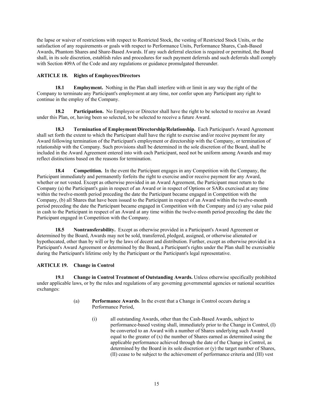 15 the lapse or waiver of restrictions with respect to Restricted Stock, the vesting of Restricted Stock Units, or the satisfaction of any requirements or goals with respect to Performance Units, Performance Shares, Cash-Based Awards, Phantom Shares and Share-Based Awards. If any such deferral election is required or permitted, the Board shall, in its sole discretion, establish rules and procedures for such payment deferrals and such deferrals shall comply with Section 409A of the Code and any regulations or guidance promulgated thereunder. ARTICLE 18. Rights of Employees/Directors 18.1 Employment. Nothing in the Plan shall interfere with or limit in any way the right of the Company to terminate any Participant's employment at any time, nor confer upon any Participant any right to continue in the employ of the Company. 18.2 Participation. No Employee or Director shall have the right to be selected to receive an Award under this Plan, or, having been so selected, to be selected to receive a future Award. 18.3 Termination of Employment/Directorship/Relationship. Each Participant's Award Agreement shall set forth the extent to which the Participant shall have the right to exercise and/or receive payment for any Award following termination of the Participant's employment or directorship with the Company, or termination of relationship with the Company. Such provisions shall be determined in the sole discretion of the Board, shall be included in the Award Agreement entered into with each Participant, need not be uniform among Awards and may reflect distinctions based on the reasons for termination. 18.4 Competition. In the event the Participant engages in any Competition with the Company, the Participant immediately and permanently forfeits the right to exercise and/or receive payment for any Award, whether or not vested. Except as otherwise provided in an Award Agreement, the Participant must return to the Company (a) the Participant's gain in respect of an Award or in respect of Options or SARs exercised at any time within the twelve-month period preceding the date the Participant became engaged in Competition with the Company, (b) all Shares that have been issued to the Participant in respect of an Award within the twelve-month period preceding the date the Participant became engaged in Competition with the Company and (c) any value paid in cash to the Participant in respect of an Award at any time within the twelve-month period preceding the date the Participant engaged in Competition with the Company. 18.5 Nontransferability. Except as otherwise provided in a Participant's Award Agreement or determined by the Board, Awards may not be sold, transferred, pledged, assigned, or otherwise alienated or hypothecated, other than by will or by the laws of decent and distribution. Further, except as otherwise provided in a Participant's Award Agreement or determined by the Board, a Participant's rights under the Plan shall be exercisable during the Participant's lifetime only by the Participant or the Participant's legal representative. ARTICLE 19. Change in Control 19.1 Change in Control Treatment of Outstanding Awards. Unless otherwise specifically prohibited under applicable laws, or by the rules and regulations of any governing governmental agencies or national securities exchanges: (a) Performance Awards. In the event that a Change in Control occurs during a Performance Period, (i) all outstanding Awards, other than the Cash-Based Awards, subject to performance-based vesting shall, immediately prior to the Change in Control, (I) be converted to an Award with a number of Shares underlying such Award equal to the greater of (x) the number of Shares earned as determined using the applicable performance achieved through the date of the Change in Control, as determined by the Board in its sole discretion or (y) the target number of Shares, (II) cease to be subject to the achievement of performance criteria and (III) vest