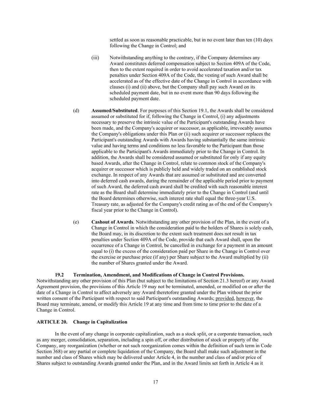 17 settled as soon as reasonable practicable, but in no event later than ten (10) days following the Change in Control; and (iii) Notwithstanding anything to the contrary, if the Company determines any Award constitutes deferred compensation subject to Section 409A of the Code, then to the extent required in order to avoid accelerated taxation and/or tax penalties under Section 409A of the Code, the vesting of such Award shall be accelerated as of the effective date of the Change in Control in accordance with clauses (i) and (ii) above, but the Company shall pay such Award on its scheduled payment date, but in no event more than 90 days following the scheduled payment date. (d) Assumed/Substituted. For purposes of this Section 19.1, the Awards shall be considered assumed or substituted for if, following the Change in Control, (i) any adjustments necessary to preserve the intrinsic value of the Participant's outstanding Awards have been made, and the Company's acquirer or successor, as applicable, irrevocably assumes the Company's obligations under this Plan or (ii) such acquirer or successor replaces the Participant's outstanding Awards with Awards having substantially the same intrinsic value and having terms and conditions no less favorable to the Participant than those applicable to the Participant's Awards immediately prior to the Change in Control. In addition, the Awards shall be considered assumed or substituted for only if any equity based Awards, after the Change in Control, relate to common stock of the Company's acquirer or successor which is publicly held and widely traded on an established stock exchange. In respect of any Awards that are assumed or substituted and are converted into deferred cash awards, during the remainder of the applicable period prior to payment of such Award, the deferred cash award shall be credited with such reasonable interest rate as the Board shall determine immediately prior to the Change in Control (and until the Board determines otherwise, such interest rate shall equal the three-year U.S. Treasury rate, as adjusted for the Company's credit rating as of the end of the Company's fiscal year prior to the Change in Control). (e) Cashout of Awards. Notwithstanding any other provision of the Plan, in the event of a Change in Control in which the consideration paid to the holders of Shares is solely cash, the Board may, in its discretion to the extent such treatment does not result in tax penalties under Section 409A of the Code, provide that each Award shall, upon the occurrence of a Change in Control, be cancelled in exchange for a payment in an amount equal to (i) the excess of the consideration paid per Share in the Change in Control over the exercise or purchase price (if any) per Share subject to the Award multiplied by (ii) the number of Shares granted under the Award. 19.2 Termination, Amendment, and Modifications of Change in Control Provisions. Notwithstanding any other provision of this Plan (but subject to the limitations of Section 21.3 hereof) or any Award Agreement provision, the provisions of this Article 19 may not be terminated, amended, or modified on or after the date of a Change in Control to affect adversely any Award theretofore granted under the Plan without the prior written consent of the Participant with respect to said Participant's outstanding Awards; provided, however, the Board may terminate, amend, or modify this Article 19 at any time and from time to time prior to the date of a Change in Control. ARTICLE 20. Change in Capitalization In the event of any change in corporate capitalization, such as a stock split, or a corporate transaction, such as any merger, consolidation, separation, including a spin off, or other distribution of stock or property of the Company, any reorganization (whether or not such reorganization comes within the definition of such term in Code Section 368) or any partial or complete liquidation of the Company, the Board shall make such adjustment in the number and class of Shares which may be delivered under Article 4, in the number and class of and/or price of Shares subject to outstanding Awards granted under the Plan, and in the Award limits set forth in Article 4 as it