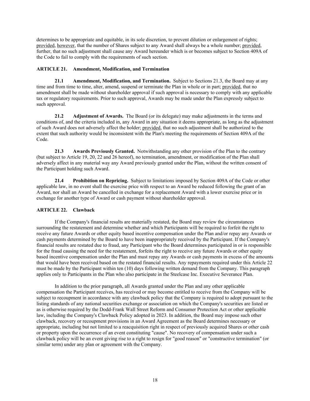 18 determines to be appropriate and equitable, in its sole discretion, to prevent dilution or enlargement of rights; provided, however, that the number of Shares subject to any Award shall always be a whole number; provided, further, that no such adjustment shall cause any Award hereunder which is or becomes subject to Section 409A of the Code to fail to comply with the requirements of such section. ARTICLE 21. Amendment, Modification, and Termination 21.1 Amendment, Modification, and Termination. Subject to Sections 21.3, the Board may at any time and from time to time, alter, amend, suspend or terminate the Plan in whole or in part; provided, that no amendment shall be made without shareholder approval if such approval is necessary to comply with any applicable tax or regulatory requirements. Prior to such approval, Awards may be made under the Plan expressly subject to such approval. 21.2 Adjustment of Awards. The Board (or its delegate) may make adjustments in the terms and conditions of, and the criteria included in, any Award in any situation it deems appropriate, as long as the adjustment of such Award does not adversely affect the holder; provided, that no such adjustment shall be authorized to the extent that such authority would be inconsistent with the Plan's meeting the requirements of Section 409A of the Code. 21.3 Awards Previously Granted. Notwithstanding any other provision of the Plan to the contrary (but subject to Article 19, 20, 22 and 26 hereof), no termination, amendment, or modification of the Plan shall adversely affect in any material way any Award previously granted under the Plan, without the written consent of the Participant holding such Award. 21.4 Prohibition on Repricing. Subject to limitations imposed by Section 409A of the Code or other applicable law, in no event shall the exercise price with respect to an Award be reduced following the grant of an Award, nor shall an Award be cancelled in exchange for a replacement Award with a lower exercise price or in exchange for another type of Award or cash payment without shareholder approval. ARTICLE 22. Clawback If the Company's financial results are materially restated, the Board may review the circumstances surrounding the restatement and determine whether and which Participants will be required to forfeit the right to receive any future Awards or other equity based incentive compensation under the Plan and/or repay any Awards or cash payments determined by the Board to have been inappropriately received by the Participant. If the Company's financial results are restated due to fraud, any Participant who the Board determines participated in or is responsible for the fraud causing the need for the restatement, forfeits the right to receive any future Awards or other equity based incentive compensation under the Plan and must repay any Awards or cash payments in excess of the amounts that would have been received based on the restated financial results. Any repayments required under this Article 22 must be made by the Participant within ten (10) days following written demand from the Company. This paragraph applies only to Participants in the Plan who also participate in the Steelcase Inc. Executive Severance Plan. In addition to the prior paragraph, all Awards granted under the Plan and any other applicable compensation the Participant receives, has received or may become entitled to receive from the Company will be subject to recoupment in accordance with any clawback policy that the Company is required to adopt pursuant to the listing standards of any national securities exchange or association on which the Company's securities are listed or as is otherwise required by the Dodd-Frank Wall Street Reform and Consumer Protection Act or other applicable law, including the Company's Clawback Policy adopted in 2023. In addition, the Board may impose such other clawback, recovery or recoupment provisions in an Award Agreement as the Board determines necessary or appropriate, including but not limited to a reacquisition right in respect of previously acquired Shares or other cash or property upon the occurrence of an event constituting "cause". No recovery of compensation under such a clawback policy will be an event giving rise to a right to resign for "good reason" or "constructive termination" (or similar term) under any plan or agreement with the Company.