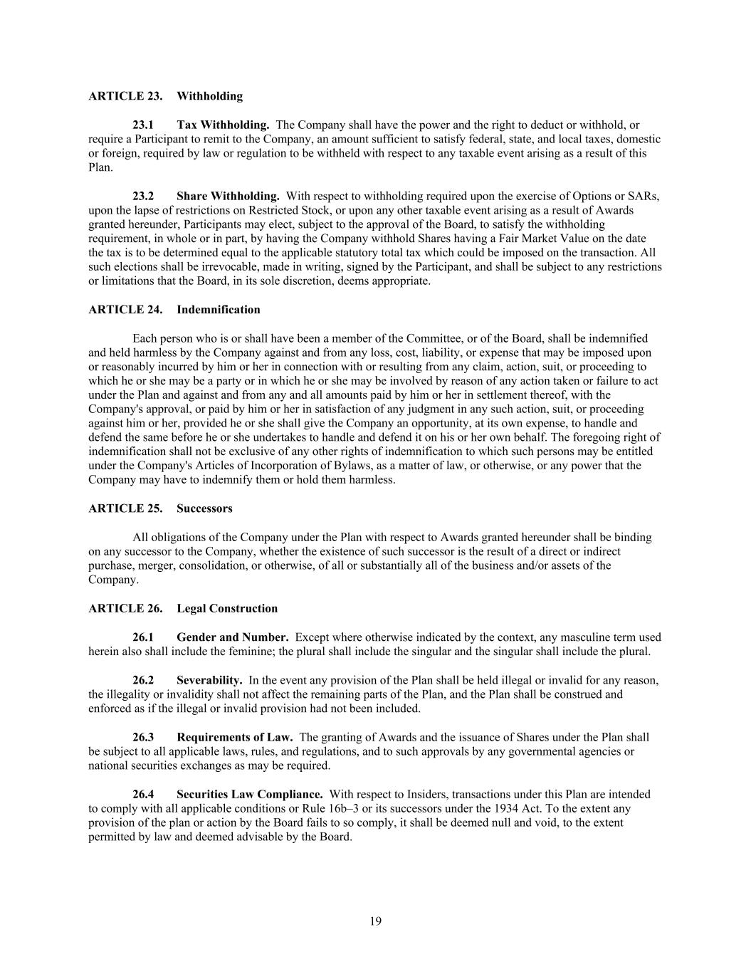 19 ARTICLE 23. Withholding 23.1 Tax Withholding. The Company shall have the power and the right to deduct or withhold, or require a Participant to remit to the Company, an amount sufficient to satisfy federal, state, and local taxes, domestic or foreign, required by law or regulation to be withheld with respect to any taxable event arising as a result of this Plan. 23.2 Share Withholding. With respect to withholding required upon the exercise of Options or SARs, upon the lapse of restrictions on Restricted Stock, or upon any other taxable event arising as a result of Awards granted hereunder, Participants may elect, subject to the approval of the Board, to satisfy the withholding requirement, in whole or in part, by having the Company withhold Shares having a Fair Market Value on the date the tax is to be determined equal to the applicable statutory total tax which could be imposed on the transaction. All such elections shall be irrevocable, made in writing, signed by the Participant, and shall be subject to any restrictions or limitations that the Board, in its sole discretion, deems appropriate. ARTICLE 24. Indemnification Each person who is or shall have been a member of the Committee, or of the Board, shall be indemnified and held harmless by the Company against and from any loss, cost, liability, or expense that may be imposed upon or reasonably incurred by him or her in connection with or resulting from any claim, action, suit, or proceeding to which he or she may be a party or in which he or she may be involved by reason of any action taken or failure to act under the Plan and against and from any and all amounts paid by him or her in settlement thereof, with the Company's approval, or paid by him or her in satisfaction of any judgment in any such action, suit, or proceeding against him or her, provided he or she shall give the Company an opportunity, at its own expense, to handle and defend the same before he or she undertakes to handle and defend it on his or her own behalf. The foregoing right of indemnification shall not be exclusive of any other rights of indemnification to which such persons may be entitled under the Company's Articles of Incorporation of Bylaws, as a matter of law, or otherwise, or any power that the Company may have to indemnify them or hold them harmless. ARTICLE 25. Successors All obligations of the Company under the Plan with respect to Awards granted hereunder shall be binding on any successor to the Company, whether the existence of such successor is the result of a direct or indirect purchase, merger, consolidation, or otherwise, of all or substantially all of the business and/or assets of the Company. ARTICLE 26. Legal Construction 26.1 Gender and Number. Except where otherwise indicated by the context, any masculine term used herein also shall include the feminine; the plural shall include the singular and the singular shall include the plural. 26.2 Severability. In the event any provision of the Plan shall be held illegal or invalid for any reason, the illegality or invalidity shall not affect the remaining parts of the Plan, and the Plan shall be construed and enforced as if the illegal or invalid provision had not been included. 26.3 Requirements of Law. The granting of Awards and the issuance of Shares under the Plan shall be subject to all applicable laws, rules, and regulations, and to such approvals by any governmental agencies or national securities exchanges as may be required. 26.4 Securities Law Compliance. With respect to Insiders, transactions under this Plan are intended to comply with all applicable conditions or Rule 16b–3 or its successors under the 1934 Act. To the extent any provision of the plan or action by the Board fails to so comply, it shall be deemed null and void, to the extent permitted by law and deemed advisable by the Board.