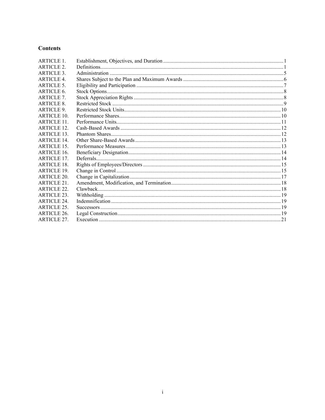 i Contents ARTICLE 1. Establishment, Objectives, and Duration .......................................................................................... 1 ARTICLE 2. Definitions......................................................................................................................................... 1 ARTICLE 3. Administration .................................................................................................................................. 5 ARTICLE 4. Shares Subject to the Plan and Maximum Awards ........................................................................... 6 ARTICLE 5. Eligibility and Participation .............................................................................................................. 7 ARTICLE 6. Stock Options .................................................................................................................................... 8 ARTICLE 7. Stock Appreciation Rights ................................................................................................................ 8 ARTICLE 8. Restricted Stock ................................................................................................................................ 9 ARTICLE 9. Restricted Stock Units ..................................................................................................................... 10 ARTICLE 10. Performance Shares......................................................................................................................... 10 ARTICLE 11. Performance Units........................................................................................................................... 11 ARTICLE 12. Cash-Based Awards ........................................................................................................................ 12 ARTICLE 13. Phantom Shares ............................................................................................................................... 12 ARTICLE 14. Other Share-Based Awards ............................................................................................................. 13 ARTICLE 15. Performance Measures .................................................................................................................... 13 ARTICLE 16. Beneficiary Designation .................................................................................................................. 14 ARTICLE 17. Deferrals .......................................................................................................................................... 14 ARTICLE 18. Rights of Employees/Directors ....................................................................................................... 15 ARTICLE 19. Change in Control ........................................................................................................................... 15 ARTICLE 20. Change in Capitalization ................................................................................................................. 17 ARTICLE 21. Amendment, Modification, and Termination .................................................................................. 18 ARTICLE 22. Clawback......................................................................................................................................... 18 ARTICLE 23. Withholding .................................................................................................................................... 19 ARTICLE 24. Indemnification ............................................................................................................................... 19 ARTICLE 25. Successors ....................................................................................................................................... 19 ARTICLE 26. Legal Construction .......................................................................................................................... 19 ARTICLE 27. Execution ........................................................................................................................................ 21