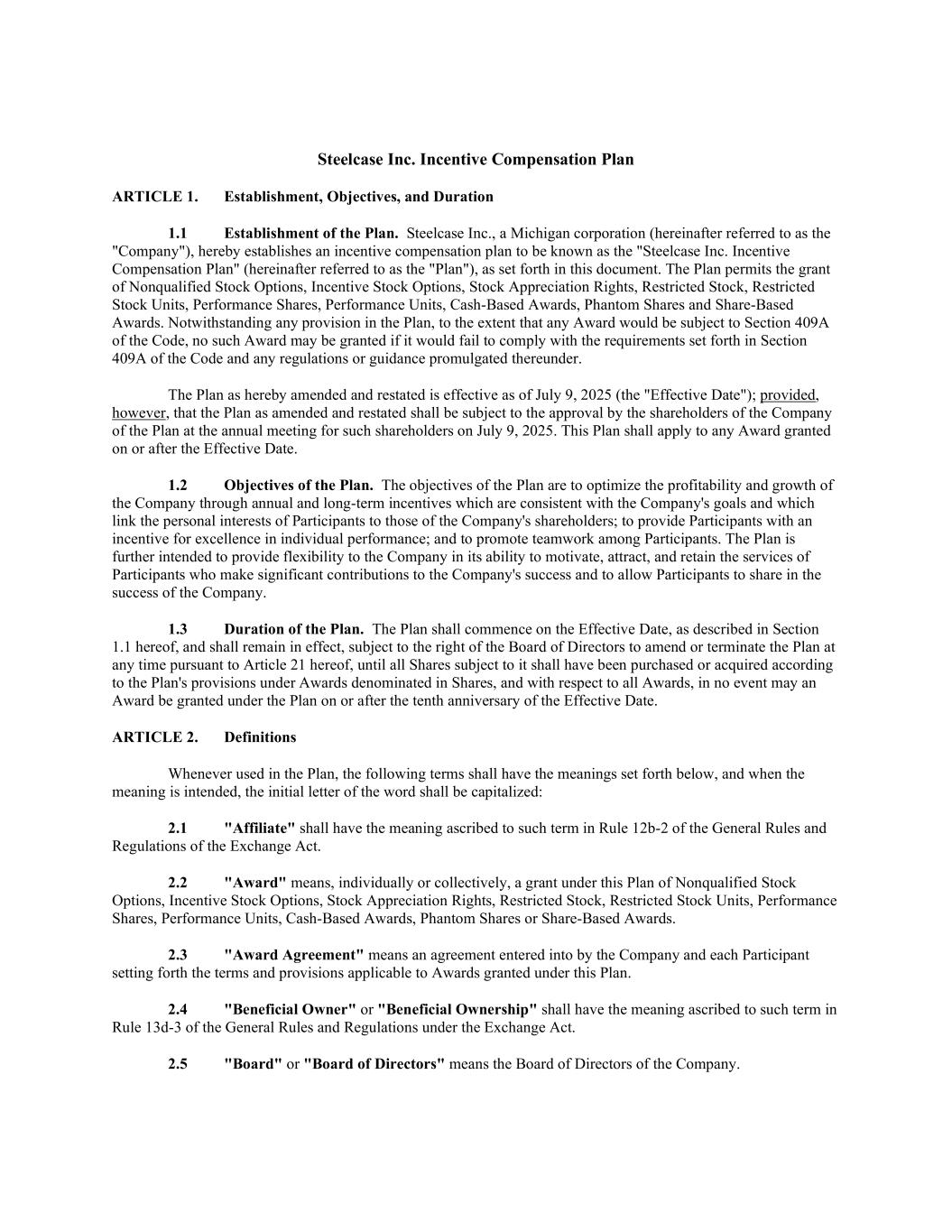 Steelcase Inc. Incentive Compensation Plan ARTICLE 1. Establishment, Objectives, and Duration 1.1 Establishment of the Plan. Steelcase Inc., a Michigan corporation (hereinafter referred to as the "Company"), hereby establishes an incentive compensation plan to be known as the "Steelcase Inc. Incentive Compensation Plan" (hereinafter referred to as the "Plan"), as set forth in this document. The Plan permits the grant of Nonqualified Stock Options, Incentive Stock Options, Stock Appreciation Rights, Restricted Stock, Restricted Stock Units, Performance Shares, Performance Units, Cash-Based Awards, Phantom Shares and Share-Based Awards. Notwithstanding any provision in the Plan, to the extent that any Award would be subject to Section 409A of the Code, no such Award may be granted if it would fail to comply with the requirements set forth in Section 409A of the Code and any regulations or guidance promulgated thereunder. The Plan as hereby amended and restated is effective as of July 9, 2025 (the "Effective Date"); provided, however, that the Plan as amended and restated shall be subject to the approval by the shareholders of the Company of the Plan at the annual meeting for such shareholders on July 9, 2025. This Plan shall apply to any Award granted on or after the Effective Date. 1.2 Objectives of the Plan. The objectives of the Plan are to optimize the profitability and growth of the Company through annual and long-term incentives which are consistent with the Company's goals and which link the personal interests of Participants to those of the Company's shareholders; to provide Participants with an incentive for excellence in individual performance; and to promote teamwork among Participants. The Plan is further intended to provide flexibility to the Company in its ability to motivate, attract, and retain the services of Participants who make significant contributions to the Company's success and to allow Participants to share in the success of the Company. 1.3 Duration of the Plan. The Plan shall commence on the Effective Date, as described in Section 1.1 hereof, and shall remain in effect, subject to the right of the Board of Directors to amend or terminate the Plan at any time pursuant to Article 21 hereof, until all Shares subject to it shall have been purchased or acquired according to the Plan's provisions under Awards denominated in Shares, and with respect to all Awards, in no event may an Award be granted under the Plan on or after the tenth anniversary of the Effective Date. ARTICLE 2. Definitions Whenever used in the Plan, the following terms shall have the meanings set forth below, and when the meaning is intended, the initial letter of the word shall be capitalized: 2.1 "Affiliate" shall have the meaning ascribed to such term in Rule 12b-2 of the General Rules and Regulations of the Exchange Act. 2.2 "Award" means, individually or collectively, a grant under this Plan of Nonqualified Stock Options, Incentive Stock Options, Stock Appreciation Rights, Restricted Stock, Restricted Stock Units, Performance Shares, Performance Units, Cash-Based Awards, Phantom Shares or Share-Based Awards. 2.3 "Award Agreement" means an agreement entered into by the Company and each Participant setting forth the terms and provisions applicable to Awards granted under this Plan. 2.4 "Beneficial Owner" or "Beneficial Ownership" shall have the meaning ascribed to such term in Rule 13d-3 of the General Rules and Regulations under the Exchange Act. 2.5 "Board" or "Board of Directors" means the Board of Directors of the Company.