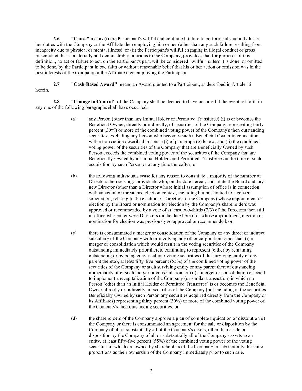 2 2.6 "Cause" means (i) the Participant's willful and continued failure to perform substantially his or her duties with the Company or the Affiliate then employing him or her (other than any such failure resulting from incapacity due to physical or mental illness), or (ii) the Participant's willful engaging in illegal conduct or gross misconduct that is materially and demonstrably injurious to the Company; provided, that for purposes of this definition, no act or failure to act, on the Participant's part, will be considered "willful" unless it is done, or omitted to be done, by the Participant in bad faith or without reasonable belief that his or her action or omission was in the best interests of the Company or the Affiliate then employing the Participant. 2.7 "Cash-Based Award" means an Award granted to a Participant, as described in Article 12 herein. 2.8 "Change in Control" of the Company shall be deemed to have occurred if the event set forth in any one of the following paragraphs shall have occurred: (a) any Person (other than any Initial Holder or Permitted Transferee) (i) is or becomes the Beneficial Owner, directly or indirectly, of securities of the Company representing thirty percent (30%) or more of the combined voting power of the Company's then outstanding securities, excluding any Person who becomes such a Beneficial Owner in connection with a transaction described in clause (i) of paragraph (c) below, and (ii) the combined voting power of the securities of the Company that are Beneficially Owned by such Person exceeds the combined voting power of the securities of the Company that are Beneficially Owned by all Initial Holders and Permitted Transferees at the time of such acquisition by such Person or at any time thereafter; or (b) the following individuals cease for any reason to constitute a majority of the number of Directors then serving: individuals who, on the date hereof, constitute the Board and any new Director (other than a Director whose initial assumption of office is in connection with an actual or threatened election contest, including but not limited to a consent solicitation, relating to the election of Directors of the Company) whose appointment or election by the Board or nomination for election by the Company's shareholders was approved or recommended by a vote of at least two-thirds (2/3) of the Directors then still in office who either were Directors on the date hereof or whose appointment, election or nomination for election was previously so approved or recommended; or (c) there is consummated a merger or consolidation of the Company or any direct or indirect subsidiary of the Company with or involving any other corporation, other than (i) a merger or consolidation which would result in the voting securities of the Company outstanding immediately prior thereto continuing to represent (either by remaining outstanding or by being converted into voting securities of the surviving entity or any parent thereto), at least fifty-five percent (55%) of the combined voting power of the securities of the Company or such surviving entity or any parent thereof outstanding immediately after such merger or consolidation, or (ii) a merger or consolidation effected to implement a recapitalization of the Company (or similar transaction) in which no Person (other than an Initial Holder or Permitted Transferee) is or becomes the Beneficial Owner, directly or indirectly, of securities of the Company (not including in the securities Beneficially Owned by such Person any securities acquired directly from the Company or its Affiliates) representing thirty percent (30%) or more of the combined voting power of the Company's then outstanding securities; or (d) the shareholders of the Company approve a plan of complete liquidation or dissolution of the Company or there is consummated an agreement for the sale or disposition by the Company of all or substantially all of the Company's assets, other than a sale or disposition by the Company of all or substantially all of the Company's assets to an entity, at least fifty-five percent (55%) of the combined voting power of the voting securities of which are owned by shareholders of the Company in substantially the same proportions as their ownership of the Company immediately prior to such sale.